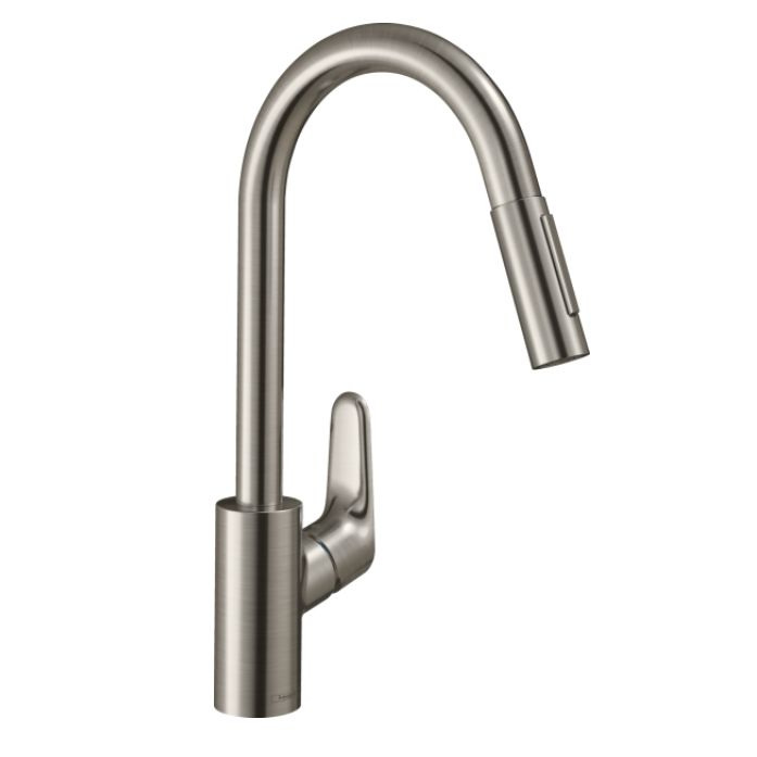 \nСмеситель для кухни Hansgrohe Focus Focus 240 2jet с выдвижным изливом, стальной (31815800) - отличается эффектным видом, функциональностью и простотой применения, а материалы высокого качества, из которых он выполнен, гарантируют надежную работу в течение многих лет.