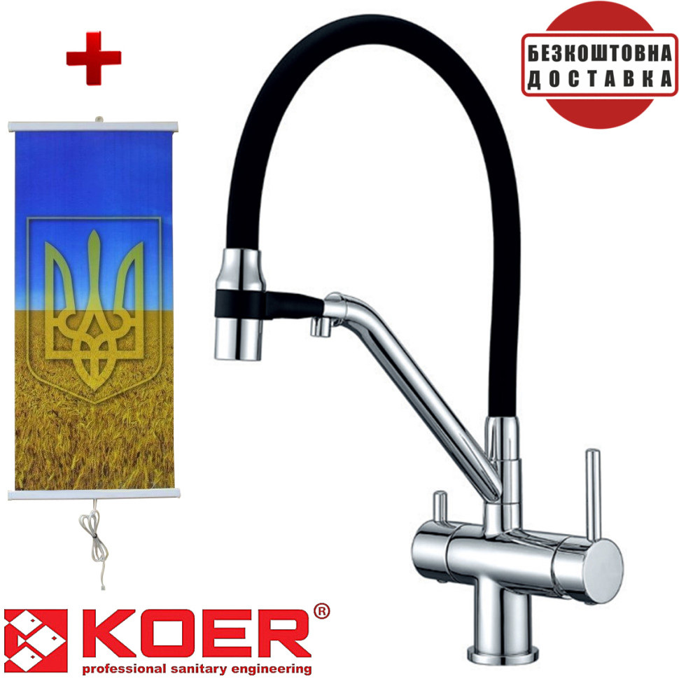 Змішувач для кухні з виходом під осмос Koer KB-72006-01, Чехія (колір хром) чорний силіконовий гусак + подарунок