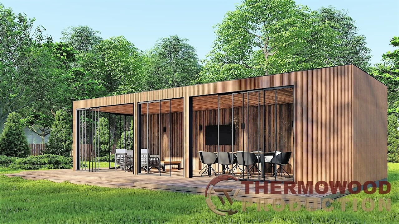 Закрытая зимняя современная беседка Modern Gazebo 016 с панорамными раздвижными окнами 10,3х3,5м Thermowood Production. Проектирование, строительство, монтаж беседок в Украине и Европе ✅ Терраса для модульной беседки ???? Рекомендуем заказать с беседкой крытую террасу с покрытием поликарбонатом и террасной термо доской. Это кардинально изменит общий вид беседки. ???? Боковые стороны террасы можно закрыть надежными мягкими окнами из прозрачного ПВХ материала, что позволит использование террасы в течение года с использованием УФО-нагревателя. ???? На террасе можем установить деревянную мебель из термодерева нашего производства, которая не боится погодного воздействия: большой стол, скамейки, кресла, лежаки. ???? Также построение крытой террасы сменит полезную площадь постройки, рекомендуем повторить размер самой беседки, то есть это изменит общую площадь в два раза! ???? Смена общей площади застройки в два раза за счет террасы гораздо экономнее, чем строить еще одну беседку. Возможна еще дополнительная боковая открытая терраса с барбекю. Дополнительная информация ☎️ Если Вы хотите получить чертежи беседки, пожалуйста, дайте запрос на 38067-201-50-50 Viber, Telegram, Whats App. ☎️ Если Вы хотите получить дополнительные фото по каждой беседки со всех сторон, пожалуйста, дайте запрос на 38067-201-50-50 Viber, Telegram, Whats App. ☎️ Если Вы хотите получить онлайн видео связь непосредственно с производства, пожалуйста, дайте запрос на 38067-201-50-50 Viber, Telegram, Whats App. Всех заинтересованных приглашаем на наше производство в Житомире на просмотр акционных беседок, а также процесса производства домов, саун, беседок, мебели из массива. При приобретении беседки Вы получите 15% скидку на качественную мебель из массива дерева собственного производства со склада производителя. Монтаж на объекте Заказчика 10% от стоимости беседки ✅ Комплектация дома: наружная обшивка - планкен, имитация бруса из термодерева; внутрення обшивка - вагонка, имитация бруса, гипсокартон под отделку; окна и двери ламинированные металлопластиковые цвет на выбор Заказчика; монтаж беседки - 10% от стоимости дома; внутренние сантехнические и электросети, фундамент просчитываются отдельно в зависимости от проекта. возможно устройство в беседке печки для барбекю, сауны, летней кухни; проект беседки с панорамным остеклением, проектирование остекления беседки. ✅ Материалы для строительства деревянной беседки: • доска пола деревянная, плинтус пола; • кровля - гибкая битумная черепица; • деревянные столбы, перила столярные клееные; • утеплитель - минеральная базальтовая вата 150 мм, гидробарьер, паробарьер; ✅ Деревянная мебель из массива древесины для беседок При заказе у нас деревянной беседки скидка 15% на деревянную мебель. Похожие новости: Деревянные беседки на Вашем участке Как правильно выбрать садовую мебель для Вашего загородного дома?