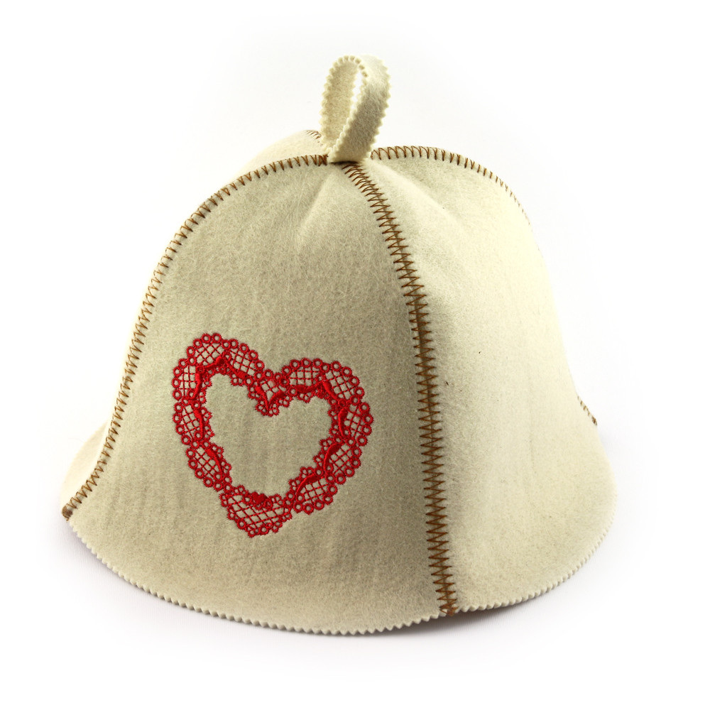 Банна шапка незамінний аксесуар при відвідуванні лазні та сауни. Окрім оригінального зовнішнього вигляду або веселого слогана вишитого на ній шапка виконує дуже важливу роль – вона береже голову від перегріву. Ми рекомендуємо підходити до вибору шапки для лазні та сауни не менш відповідально, ніж при виборі іншого головного убору.Банна шапка з вишивкою «Валентинка»; виготовлена із штучного фетру. Колір фетру білий. Модель має зверху петельку, яка дозволяє повісити шапку на гачок. вироби кольорові. Сушити потрібно виріб у розгорнутому вигляді