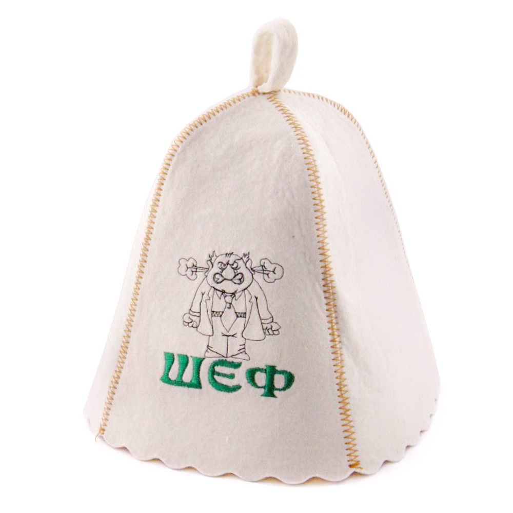 Банна шапка незамінний аксесуар при відвідуванні лазні та сауни. Окрім оригінального зовнішнього вигляду або веселого слогана вишитого на ній шапка виконує дуже важливу роль – вона береже голову від перегріву. Ми рекомендуємо підходити до вибору шапки для лазні та сауни не менш відповідально, ніж при виборі іншого головного убору.Банна шапка з вишивкою "Шеф"; виготовлена з натуральної повсті. Колір повсті білий. Модель має всередині петельку, яка дозволяє повісити шапку на гачок. Даний матеріал має стійкий колір, який не линяє і не вигоряє. режимі віджиму. Температура води не повинна перевищувати 40 градусів, особливо якщо кольорові вироби. Сушити потрібно виріб у розгорнутому вигляді.