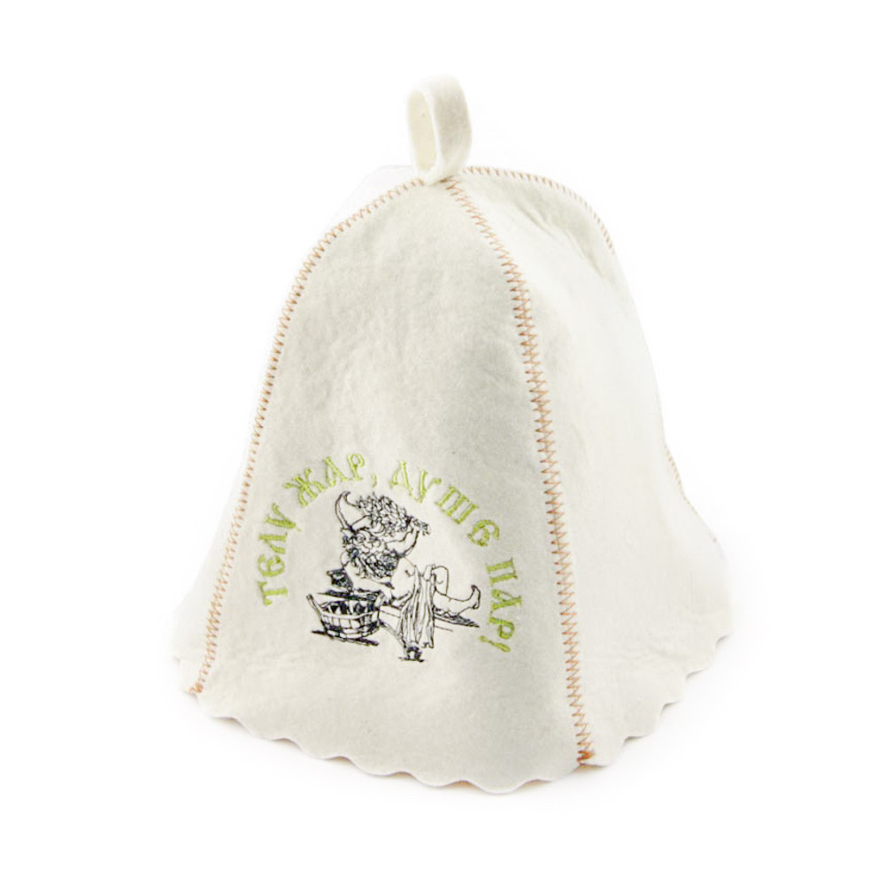 Банна шапка незамінний аксесуар при відвідуванні лазні та сауни. Окрім оригінального зовнішнього вигляду або веселого слогана вишитого на ній шапка виконує дуже важливу роль – вона береже голову від перегріву. Ми рекомендуємо підходити до вибору шапки для лазні і сауни не менш відповідально, ніж при виборі іншого головного убору. шапка з вишивкою "Тілу жар, душі пар" виготовлена з натуральної повсті, у складі якої овеча вовна. Колір білий. Модель має всередині петельку, яка дозволяє повісити шапку на гачок. Даний матеріал має стійкий колір, який не линяє і не вигоряє. Температура води не повинна перевищувати 40 градусів, особливо якщо кольорові вироби. Сушити потрібно виріб у розгорнутому вигляді.