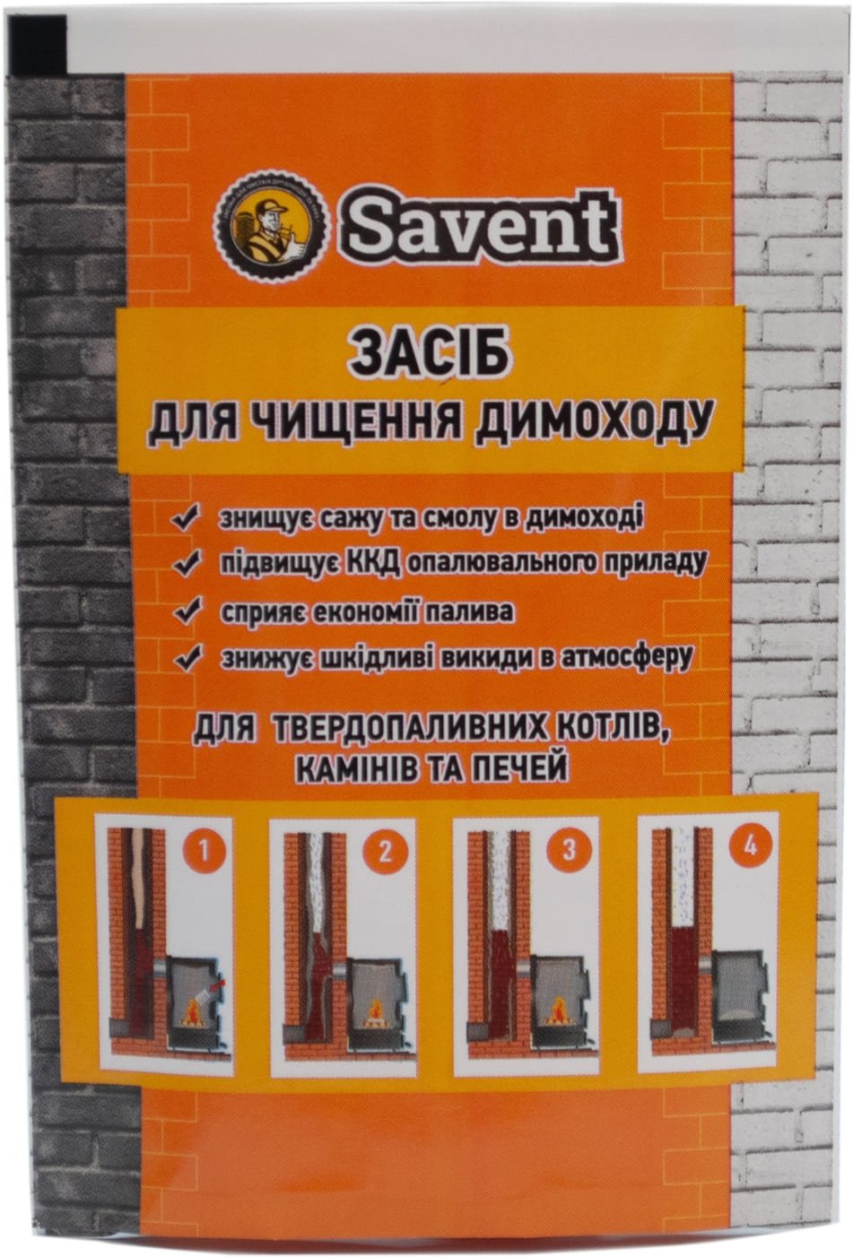 Засіб для немеханічного чищення димарів Savent 40 г – порошок нового покоління для немеханічного видалення сажі та смолистих відкладень у димарях та твердопаливних приладах. Каталітична дія засобу спрямована на розпушення сажі та смол та перетворення їх на попіл, який осідає в топці. Завдяки своїм властивостям, Savent сприяє збільшенню ККД, продовженню терміну служби димоходу та котла або каміна, економії палива та зменшенню ймовірності загоряння димоходу. Засіб призначений для очищення цегляних та металевих димоходів, твердопаливних котлів, печей, печей-камінів, камінів відкритого та закритого типу.