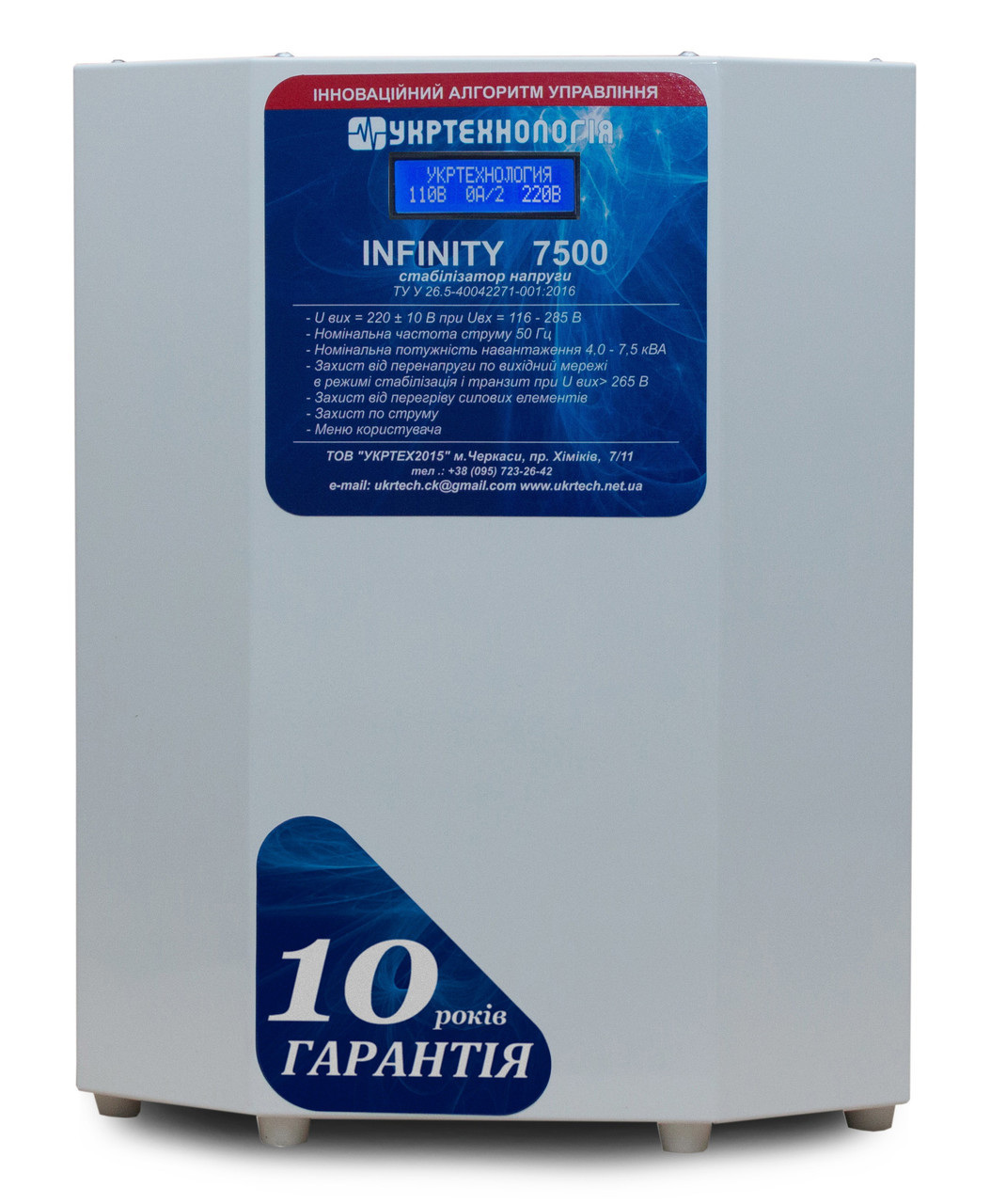 Серія Infinity, ТМ Укртехнологія м. Черкаси, розраховані на стабілізацію широкого інтервалу вхідної напруги. Мають високий рівень захисту електроприладів від стрибків у мережі, майже будь-якого побутового і промислового устаткування. Це універсальний пристрій, який працює практично при будь-якій підвищеній або зниженій вхідній напрузі 60-290 В. Дана модель ідеально підходить для заміської місцевості, оскільки після дачного сезону різко знижується споживання електромережі, тому величина напруги збільшується в середньому на 20-30%. Звичайні нормалізатори мають вузький діапазон U вх. і як правило відключаються досягнувши граничних значень. Серія Infinity продовжуватиме виконувати свої функції і видавати стабільну напругу на виході з похибкою 4.5%. Завдяки лінійці потужностей від 5 кВт до 20 кВт, стабілізатори використовуються у побуті та промислових цілях. Дані апарати можна підключати до однофазної та трифазної мережі.