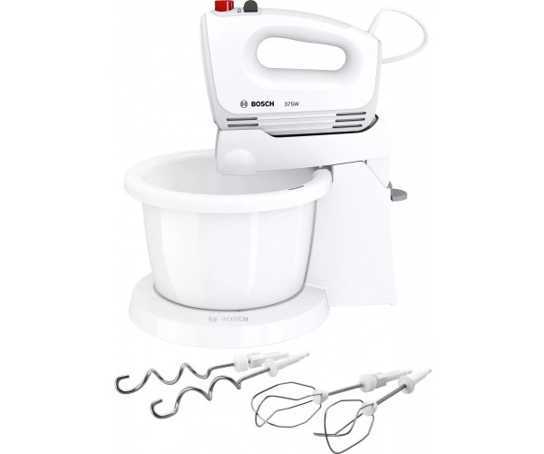 Миксер Bosch MFQ2600W производится в белом цвете в конструктивном исполнении, позволяющем использовать его как ручным, так и стационарным способом. Прибор легко фиксируется на подставке с вращающейся пластиковой чашей объёмом 3 литра. Он выполнен в белом цвете и удобен для правшей и левшей. Тихо работающий мотор мощностью 375 Вт функционирует на 4 скоростях и в турбо режиме. Выбор производится многопозиционным переключателем, удобно расположенным на эргономичной ручке. В качестве насадок применяются изготовленные из нержавеющей стали два венчика для взбивания и пара крюков, чтобы замешивать тесто. Извлекаются они нажатием специальной кнопки на ручке. Все пластиковые части миксера Bosch MFQ2600W, которые соприкасаются с продуктами, не содержат бисфенол А, а насадки могут очищаться в посудомоечной машине.