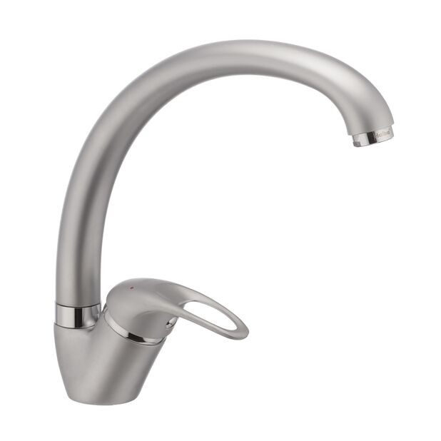 Латунный картриджный смеситель для кухни с высоким поворотным носом, комплектуется гибкой подводкой 45 см, крепление шпилька. Смеситель предназначен для встроенного монтажа на одно отверстие. Принцип смешивания воды — однорычажный.