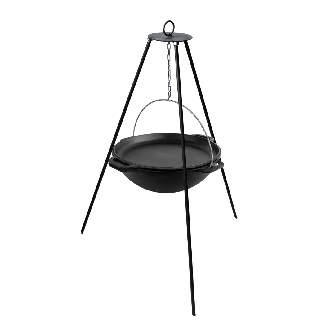 Азиатский чугунный казан емкостью 8 л, Укомплектован дужкой и чугунной крышкой-сковородой, Предназначен для приготовления блюд на костре или мангале, требующих тушения, томления и приготовления в собственном соку,