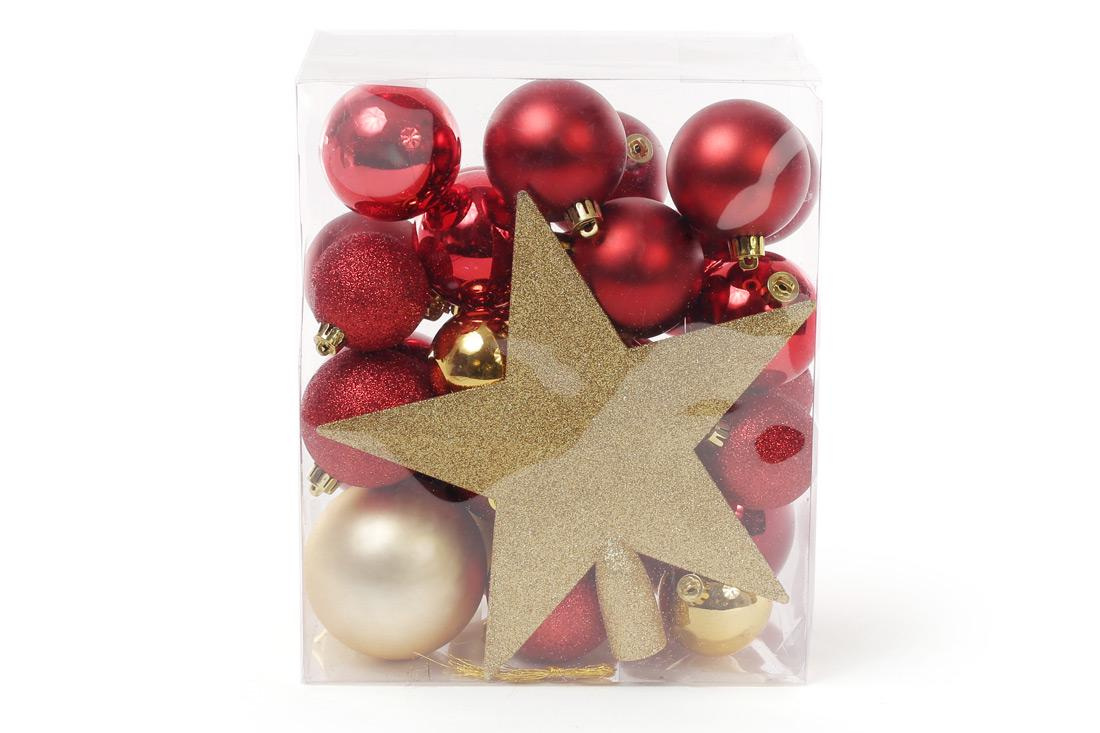 Набір новорічних куль BonaDi з верхівкою на ялинку 8/5/6 см 29 шт Червоний із золотим (147-595)