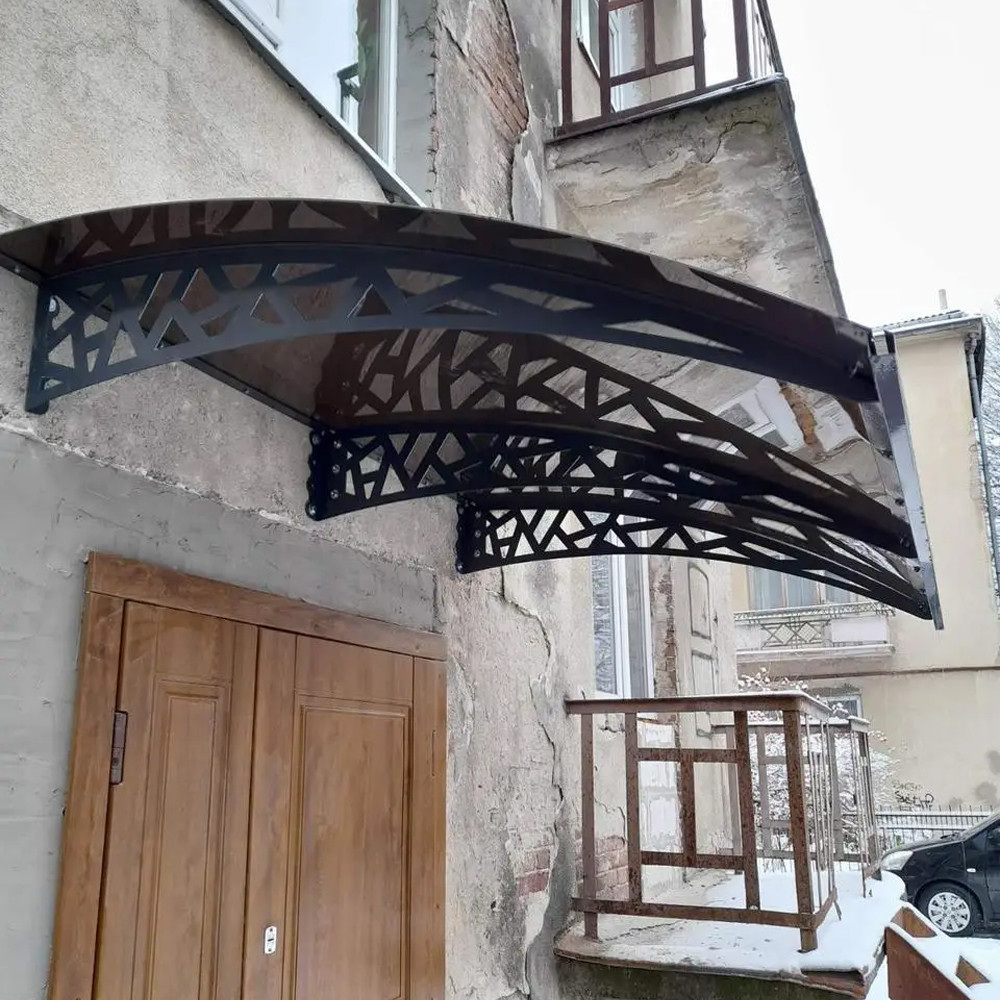 Виготовлений з високоякісного полікарбонату, цей навіс є міцним та стійким до ультрафіолетових променів, що забезпечує тривалий термін служби без вигорання або пошкоджень. Полікарбонат також має високу прозорість, дозволяючи достатньо природного світла проникати до входу.
