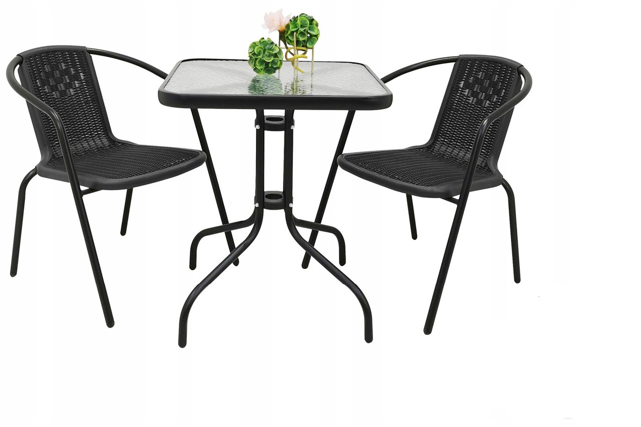Квадратный раскладной стол с элегантной стеклянной столешницей и металлическим каркасом, идеальный стол как для террасы, так и для балкона. Столешница - стекло Рама стола - сталь Размер - 60x60 см Высота - 70 см Форма - квадратный Цвет - черный Садовый стул Jumi Garden BISTRO - черного цвета. Удобные садовые кресла, которые идеально подходят для сада, участка или террасы. Обшивка стула с техноротанга - идеально подходит для садов - устойчива к погодным умов.Стильци поставляются в полном объеме - есть возможность укладки (составляя одно на другое). Технические данные: Материал - металл, техноротанг черный цвет Складной - нет Количество положений спинки - 1 Глубина (в см) 62 Общая ширина (в см) 53 Общая высота (в см) 73 Подлокотники - так Состоят - так Рекомендуемый уход - протирание влажной тканью Максимальная нагрузка - 120 кг.