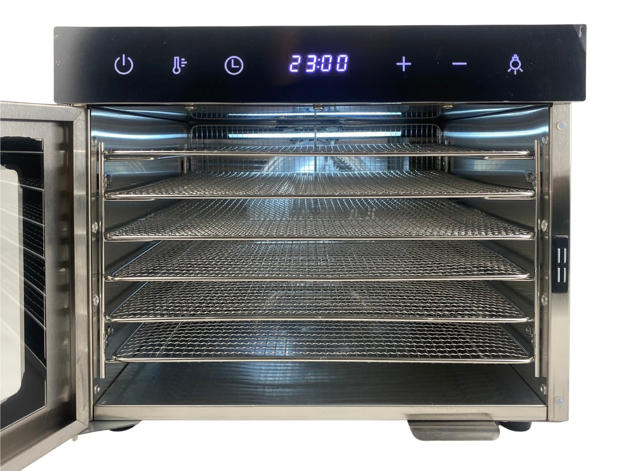 Дегидратор профессиональный Tekhniko DH-06H-BK (6 лотков) черный Профессиональный Дегидратор Tekhniko DH-06H-BK (6 лотков) Модель: DH-06H-BK Цвет: черный Мощность: 500 Вт (max) Номинальная мощность: 400 Вт Количество лотков: 6 шт Высота между лотками: 35 мм Вместительность сырых продуктов на 1 лотке: 0,5-0,8 кг Общая вместительность сырых продуктов: ~ 5 кг Размер лотка: 30*28 см Напряжение: 220-240 В, 50 Гц Температура: 30~90°C (шаг 5°C) Таймер, диапазон времени: 0-24 часа (шаг 30 мин) Уровень шума: 45-50 дБ Размер: Ш 34,5 * Г 39,5 * В 28,5 см Вес: 8,0 кг Габариты упаковки: Ш 39 * Г 45 * В 33 см Вес с упаковкой: 8,8 кг Стандартная упаковка: 7-слойная картонная коробка, выдерживающая ISTA 1A Гарантия: 12 мес Особенности: Светодиодный дисплей Двухслойный корпус из нержавеющей стали Внутренняя светодиодная подсветка Оцинкованный поддон для крошек и воды Магнитный замок дверцы Лотки из нержавеющей стали SUS304 Корпус из нержавеющей стали SUS201 Алюминиевая ручка Свойства: 6 лотков большой емкости, вмещает до 5 кг свежих продуктов. 1 двигатель + 1 система сушки лопастным вентилятором - лучший эффект и более высокая эффективность. Размер лотков составляет 300 X 280 мм, а зазор между двумя лотками составляет 350 мм. Прозрачное закаленное стекло, удобно для наблюдения за сушкой внутри. Возможность сушить все виды фруктов, овощей, мяса, рибы, морепродуктов, злаков, трав, бобов, закусок и т. д. Точное цифровое управление, простота в эксплуатации, низкий уровень повреждения деталей. Корпус из нержавеющей стали SUS201 толщиной 0,6–0,8 мм, лотки из нержавеющей стали SUS304 Комплектация Дегидратор Tekhniko DH-06H-SS 6 лотков из нержавеющей стали 2 шт - Коврик силиконовый для пастилы Tekhniko ChefMat CM-350 2 шт - Коврик мелкоячеистый Tekhniko Fine Mesh Sheet FMS-220 2 шт - Силиконовый держатель-прихватка Tekhniko HotHand HH-200 Поддон для сбора воды и крошек Книга рецептов (укр.язык) Инструкция (укр.язык) Гарантийный талон