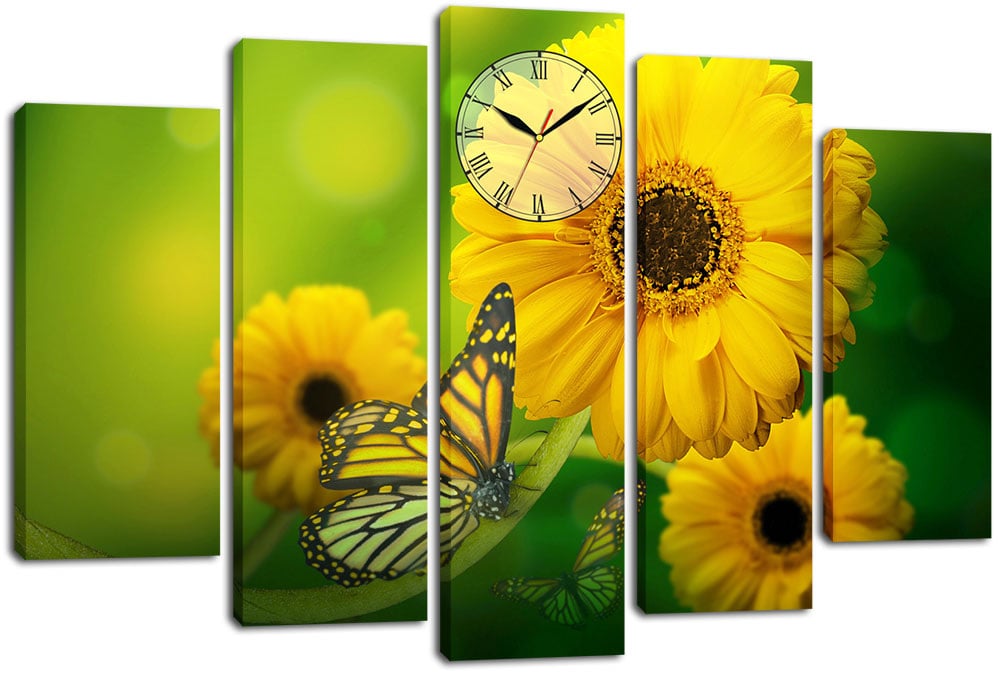 Розміри модулів: 32x80см – 1шт, 20x70см – 2шт, 20x60см – 2шт. Тихохідний механізм. Модульні картини з годинником – це стильне рішення для Вашого дизайну, яке миттєво перетворить навколишнє оточення! Модульний годинник - це кілька картин, які поєднуються тематичністю, сюжетною лінією або певною палітрою кольорів і доповнюються працюючим аксесуаром. Годинник-картина має якісний кварцовий механізм, який забезпечує тривалу ефективну роботу аксесуара з мінімальною секундною похибкою. Хочете купити годинник, але лякає дратівливий монотонний звук, який заважає відпочивати та міцно спати? Не хвилюйтеся, ці картини-годинники абсолютно безшумні! Ще однією приємною новиною для наших покупців, окрім доступної ціни від виробника, є річна гарантія на наш годинник.