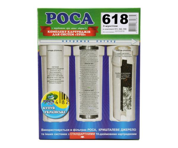 Комплект змінних картриджів призначений для очищення питної води. Використовується в трехкорпусних фільтрах "Роса" та фільтрах інших виробників. Забезпечує глибоке очищення води від хлору, органічних сполук і інших домішок. Включає картриджі, необхідні для повного циклу очищення: на першому місці картридж механічної очистки Роса 511, який забезпечує видалення піску, іржі та інших механічних забруднень, на другому - картридж Роса 542 виготовлений в Таїланді на замовлення компанії "Роса ". Натуральна шкаралупа кокосового горіха, використана в якості сировини для активованого вугілля в поєднанні з сучасною технологією виробництва забезпечує картриджу унікальні сорбційні властивості. Це робить його на порядок вище традиційних картриджів Carbon Block Роса 541,виготовлених шляхом екструдування із застосуванням поліетилену в якості сполучного. Дивіться в YouTube Thai Carbon Block. Та на третьому - картридж Роса 558, який містить високоякісне активоване вугілля з шкаралупи кокосового горіха та шунгіт. При взаємодії з водою шунгіт: структурує її і робить біологічно активною, очищає від шкідливих домішок (нітрати, нітрити, важкі метали, хлорорганічні сполуки, колоїдне залізо водопровідних труб, пестициди, діоксини, феноли, нафтопродукти, радіонукліди, бактерії, віруси), насичує організм корисними макро- і мікроелементами і поглинає шкідливі елементи, надає воді бактерицидну і антиоксидантну дію.