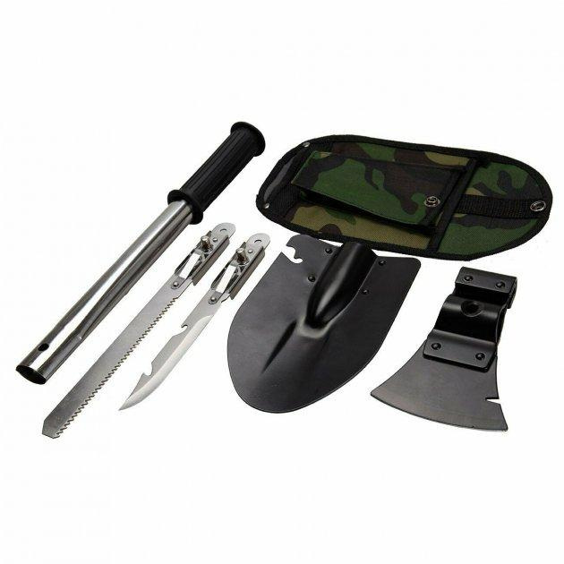 Лопата саперна туристична Military Набір похідний 5 в 1 Лопата Ніж Сокира Пила Відкривачка Туристична лопатка – незамінний інструмент для туристів, рибалок, мисливців та автомобілістів. Стане в нагоді на дачі і на пікніку. Лопатка компактна, забирається в чохол і не займає багато місця. Рукоятка лопати зроблена з металу з гумовим покриттям і не піддається корозії. Штик лопати забезпечений відкривалкою для пляшок і банок, а інший край має зубчасту насічку. Універсальна туристична саперна лопата 5 в 1 – це зручна та незамінна річ, яка може знадобитися у будь-який момент. За рахунок своїх компактних розмірів та невеликої ваги цей комплект дуже зручно транспортувати. Ручка та інші частини виконані з товстої полегшеної сталі, що дасть Вам впевненість у тому, що вона не зламається і не погнеться в потрібний момент.За допомогою туристичного набору Ви завжди зможете копати, рубати, пиляти, різати та відкривати кришки «Сніданку туриста» та напоїв туриста. Переваги: Зручна та практична у похідних умовах, на відпочинку, полюванні, рибалці тощо. Ніж-штик і пилка ховаються в ручку і завжди під рукою. Ручка з держателем гуми на кінці. Чохол із щільної тканини для безпечного транспортування та зберігання. Чохол кріпиться на пояс. Матеріал виконаний з товстої, полегшеної сталі, не гнеться та не ламається. Довжина комплекту та лопати у зібраному вигляді 47 см, вага комплекту 850 грам. В комплект входить: • лопата; • сокира; • ніж-штик; • пилка; • ручка з гумовим тримачем; • чохол. Характеристики: Тип: Туристична лопата Країна виробник: Китай Вага: 850 грам Матеріал: сталь полегшена Комплектація: лопата; сокира; ніж-штик; пилка; ручка з гумовим утримувачем; чохол Довжина у складеному стані: 47 см