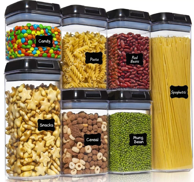 Органайзер для сипких Food storage container set (7 контейнерів) Контейнери для зберігання круп Цей набір контейнерів для зберігання продуктів, що складається з семи предметів, забезпечує безпечне зберігання зернових, макаронних виробів, закусок та багато іншого. Ці контейнери бувають різної висоти, але вони можуть бути штабельовані для економії місця. особливості: Включає 1 високий контейнер, 2 середні контейнери, 2 маленькі контейнери та 2 міні-контейнери. Усі контейнери мають кришку з відкидним верхом. Ємності з харчового пластику, що не б'ється, без БФА. Дизайн із широким горлом Герметичний ущільнювальний механізм Контейнери можна мити в посудомийній машині (кришки слід мити вручну). Комплектація: Високий контейнер (1,9 літра): 29 см заввишки, 9 см завширшки та 9 см завглибшки Середні контейнери (1,2 літра): 18 см заввишки, 9 см завширшки та 9 см завглибшки Маленькі контейнери (0,8 літра): 13 см заввишки, 9 см завширшки та 9 см завглибшки Міні - контейнери (0,5 л): 8 см заввишки, 9 см завширшки та 9 см завглибшки