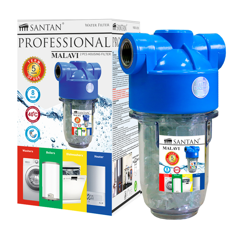 Фильтр SANTAN Malavi 2PS - предназначен для защиты приборов от накипи, тяжелых металлов и примесей, способствует продлению срока службы механизмов и их систем. Применяется для смягчения воды при подключении к стиральным машинам, бойлерам, газовым колонкам, посудомоечным машинам и котлам. Способствует защите нагревательных элементов от накипи, тяжелых металлов и примесей. Фильтр имеет три выхода для горизонтального и вертикального подключения. Преимущества: продлевает срок службы приборов не допускает образования накипи на рабочих поверхностях нагревательных элементов. снижает количество использования моющего средства. уменьшает потребление электроэнергии на подогрев воды. Рекомендации: устанавливайте фильтр исключительно на трубах подачи холодной воды, предусматривая установку обратного клапана, который предотвращает обратный ход воды в фильтр. Характеристики: Присоединительный размер: 1/2" Максимально допустимое давление: 8 Бар Максимально допустимая температура: 40°C Диаметр колбы 7 см Высота колбы 16 см Комплектация: Сердцевина, которая предотвращает попаданию гранул полифосфатной соли в систему Полифосфатная соль
