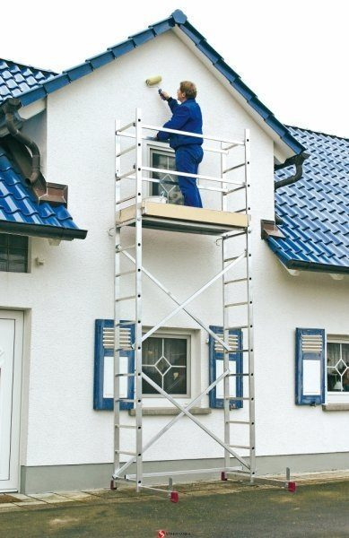 Розмір настилу: 1500х520 мм. Висота майданчика: 3 м. Висота: 4 м. Міні-риштування KRAUSE Corda Mini оснащене роликами з однієї сторони, завдяки чому може легко переміщатися однією людиною. Має антиковзні профільовані сходинки, які забезпечують безпечний вхід по внутрішній частині підмостків. Робоча висота: 5 м. Вага: 48 кг.