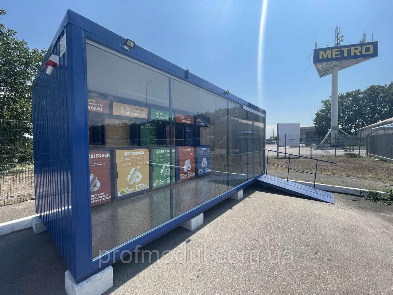 Модульна конструкція на металевому каркасі. Розмір 6х2.4м. Має зовнішнє оздоблення з профлиста синього кольору. Та скляний фасад з загартованого скла триплекс. Всередині на підлозі змонтований алюмінієвий лист.