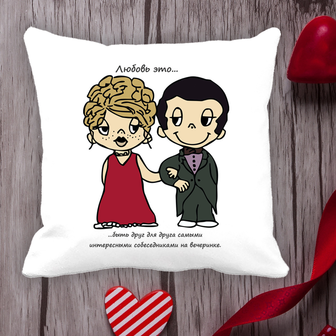 Подушка с принтом Love is "Любовь это ... быть друг для друга самыми интересными собеседниками на вечеринке" Белый Кавун П000055