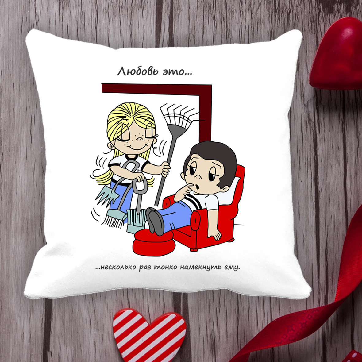 Подушка с принтом Love is "Любовь это... несколько раз тонко намекнуть ему" Белый Кавун П000078