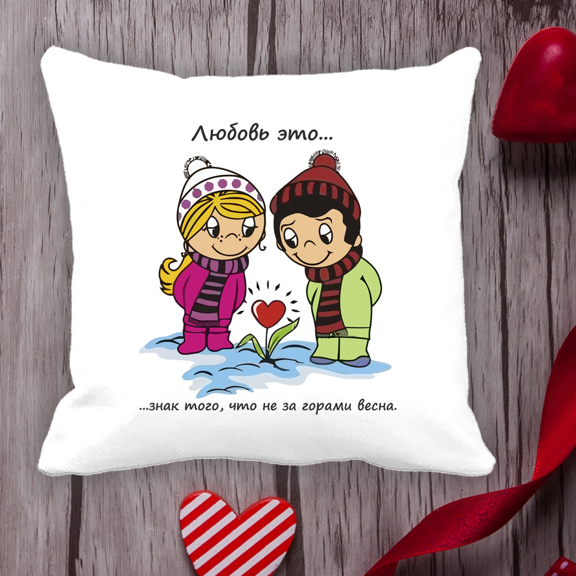 Подушка с принтом Love is "Любовь это... знак того, что не за горами весна" Белый Кавун П000093