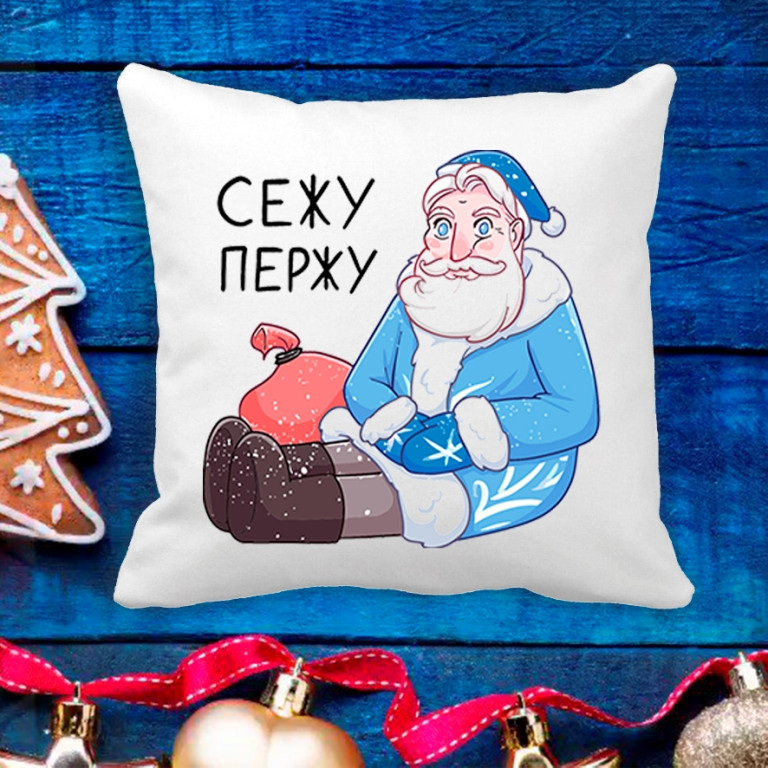 Подушка с новогодним принтом Дед Мороз "Сежу Пержу" Белый Кавун П003624