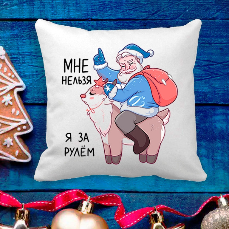 Подушка с новогодним принтом Дед Мороз на олене "Мне нельзя, я за рулем" Белый Кавун П003623