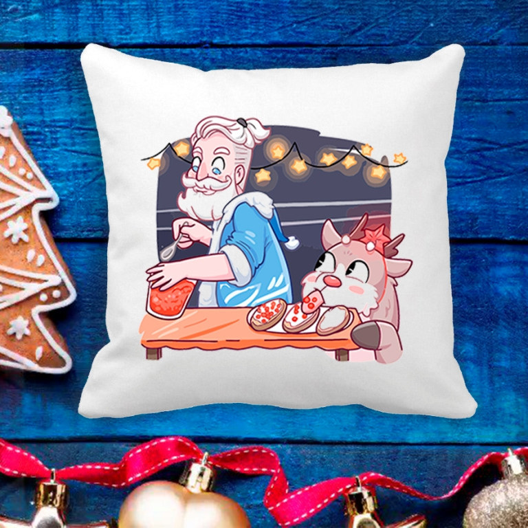 Подушка с новогодним принтом Дед мороз и Олень обедают Белый Кавун П003627