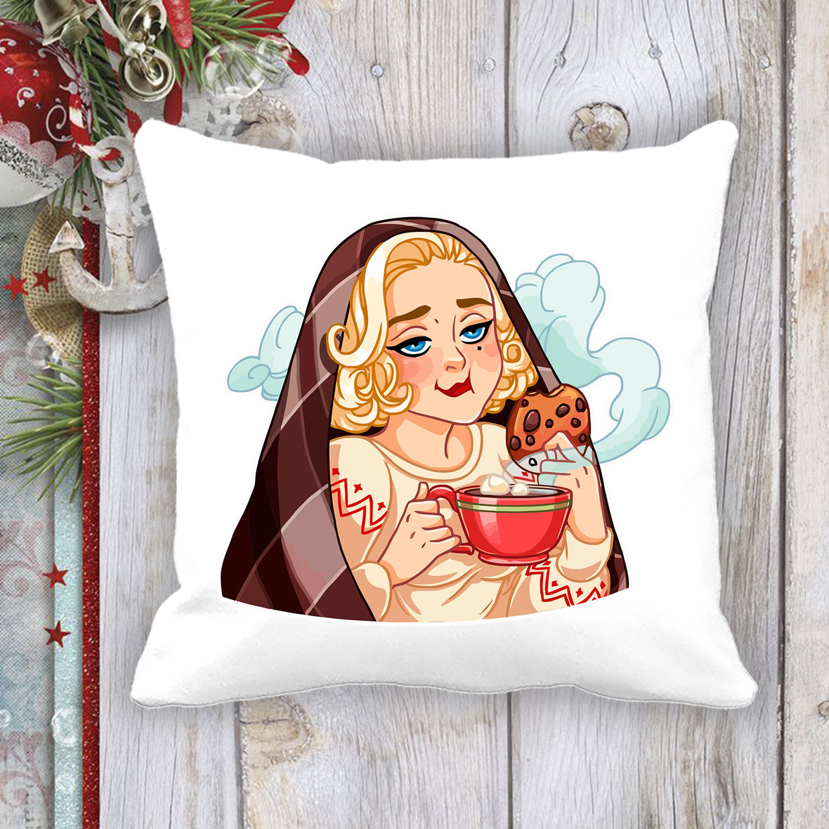 Подушка с новогодним принтом Мэрилин Монро с чаем и печеньем Белый Кавун П003676