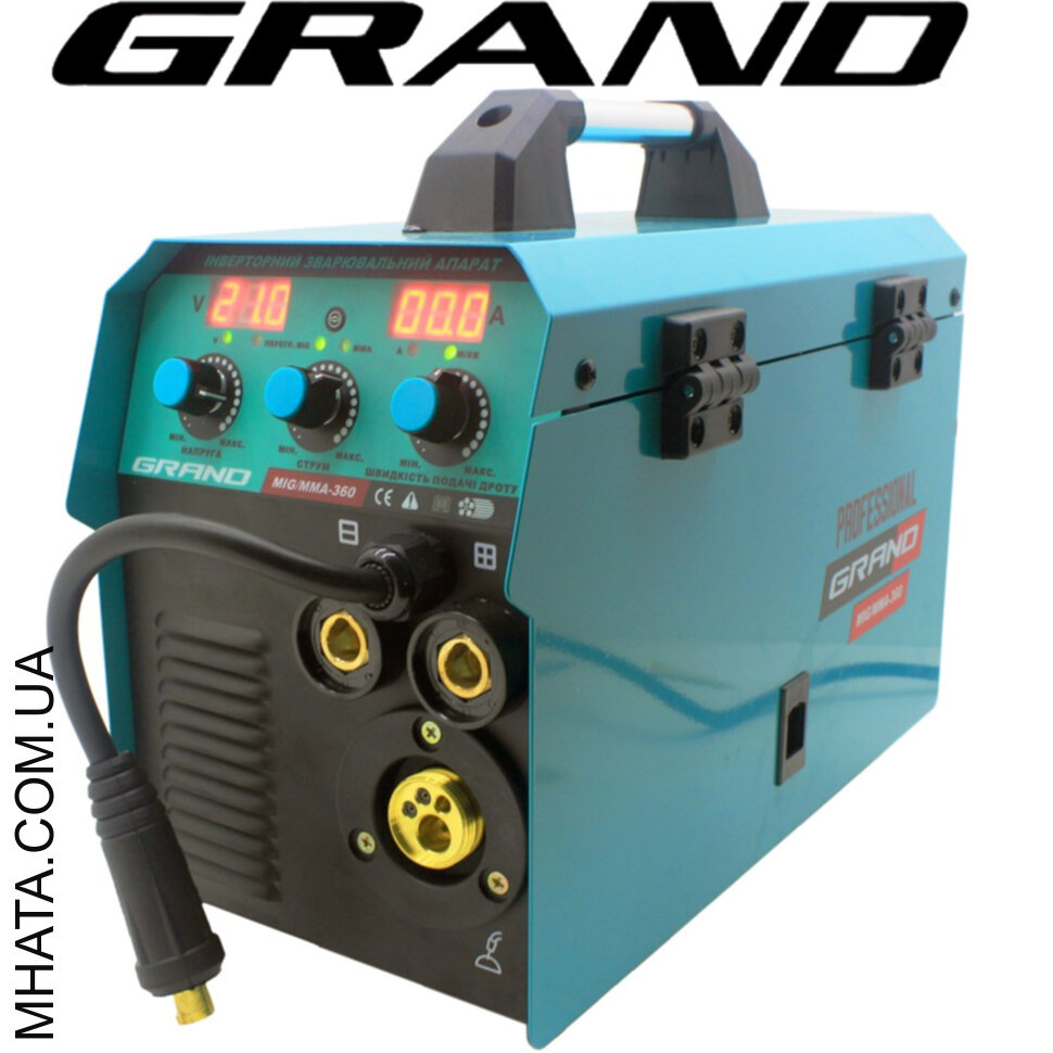Сварочный инверторный полуавтомат Grand MIG/MMA-360 - Сварочный полуавтомат Grand MIG/MMA-360 как и все агрегаты для сварки этой компании, отличается простотой в обслуживании и работе, и может использоваться для сварки, резки и наплавления металла, в двух разных режимах. Для применения флюсовой проволоки на лицевой панели аппарата предусмотрена смена полярности. По своим показателям мощности, компактности и производительности относится к профессиональному классу оборудования для сварки и может использоваться как в бытовом секторе - загородном доме, даче, гараже, так и на небольших и средних производствах, в мастерских, кузницах и станциях технического обслуживания, автомастерских.