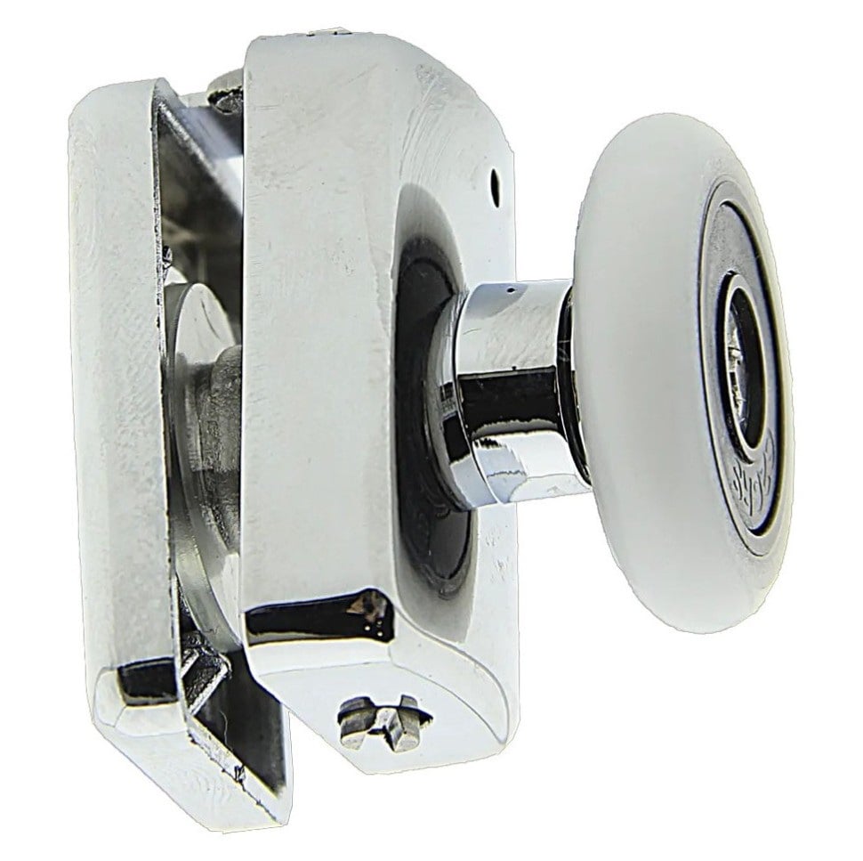 Ставится в нижней части стекла. Задняя часть ролика закрывается декоративным колпачком. Пружины спрятаны в корпусе ролика. Корпус пластиковый не возвратный, все металлические детали изготовлены из нержавеющих материалов. Посадочные детали изготовлены из пластика, что предотвращает повреждение стекла при установке ролика. При подборе ролика нужно точно знать внутренний диаметр отверстия в стекле. Колеса со специальной подшипником, с металлической сепарацией и пластиковыми сальниками, и водоотталкивающей смазкой. Колеса съемные – крепятся болтом.