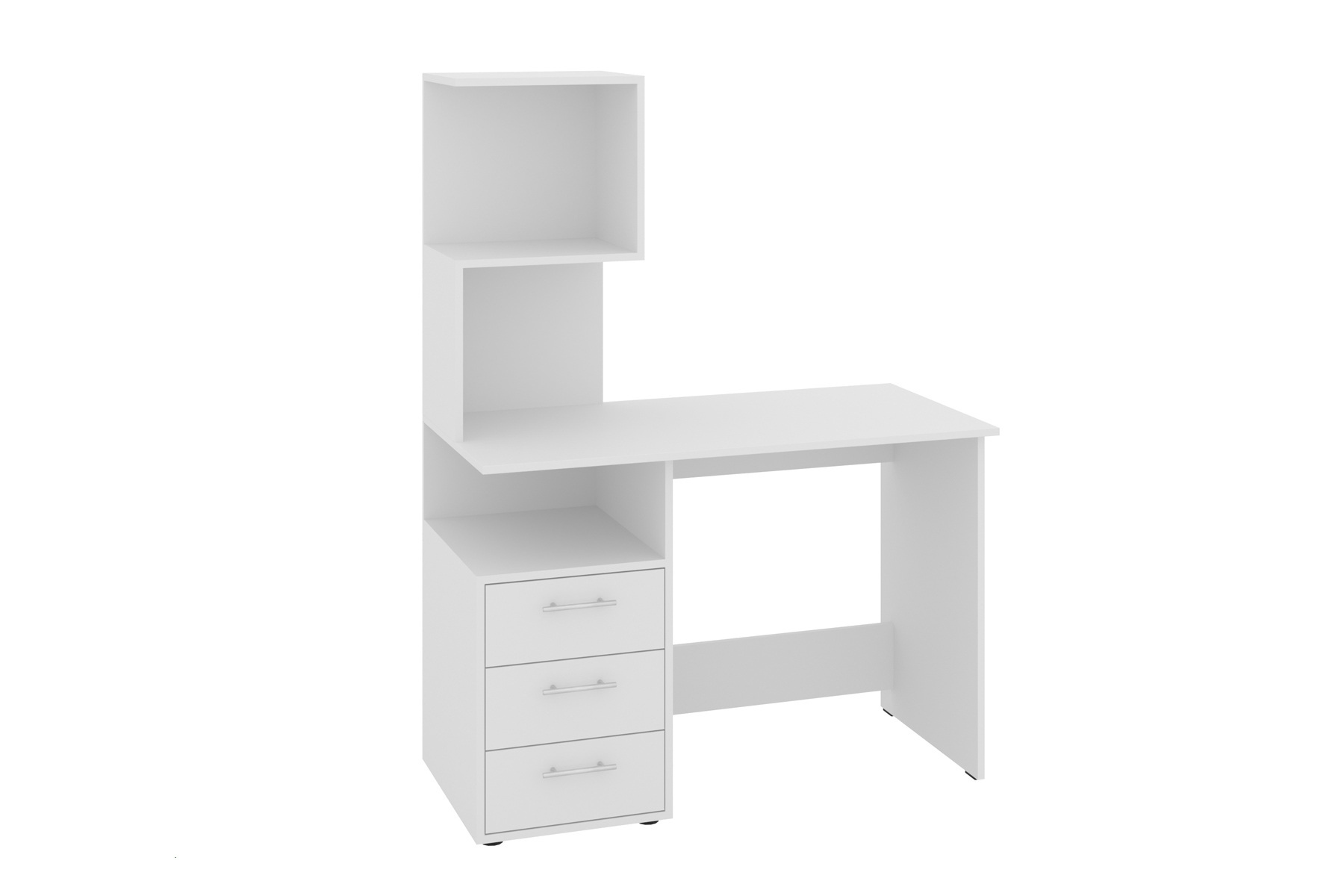 Над шухлядками розміщена функціональна конструкція з поличок, на яких зручно складати книги, папки, декоративні елементи або інші предмети, що потребують швидкого доступу. Цей стіл поєднує в собі сучасний дизайн і високу функціональність, створюючи комфортні умови для продуктивної роботи чи навчання.