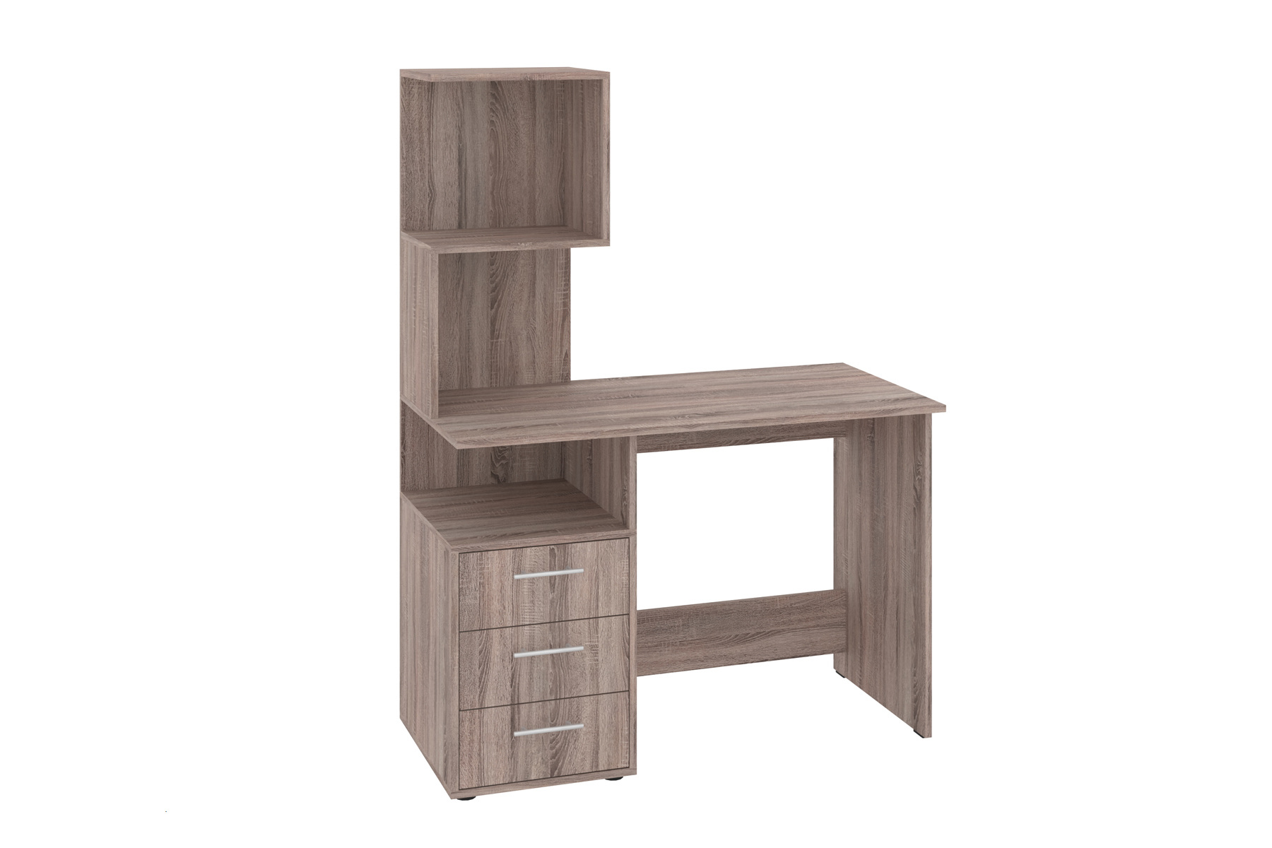 Над шухлядками розміщена функціональна конструкція з поличок, на яких зручно складати книги, папки, декоративні елементи або інші предмети, що потребують швидкого доступу. Цей стіл поєднує в собі сучасний дизайн і високу функціональність, створюючи комфортні умови для продуктивної роботи чи навчання.