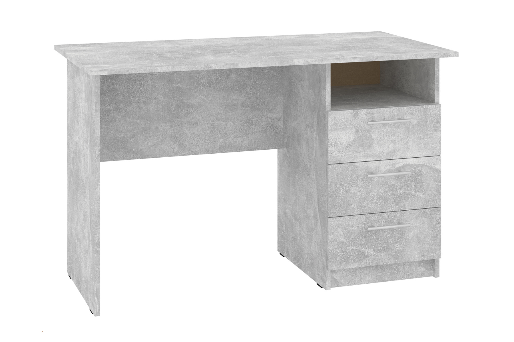 Стіл оснащений трьома висувними шухлядами, які забезпечують достатньо місця для зберігання. Над ними розташована відкрита поличка для речей, папок чи паперів. Цей письмовий стіл стане простим, але цінним доповненням до вашого робочого середовища, поєднуючи в собі невибагливість і функціональність.