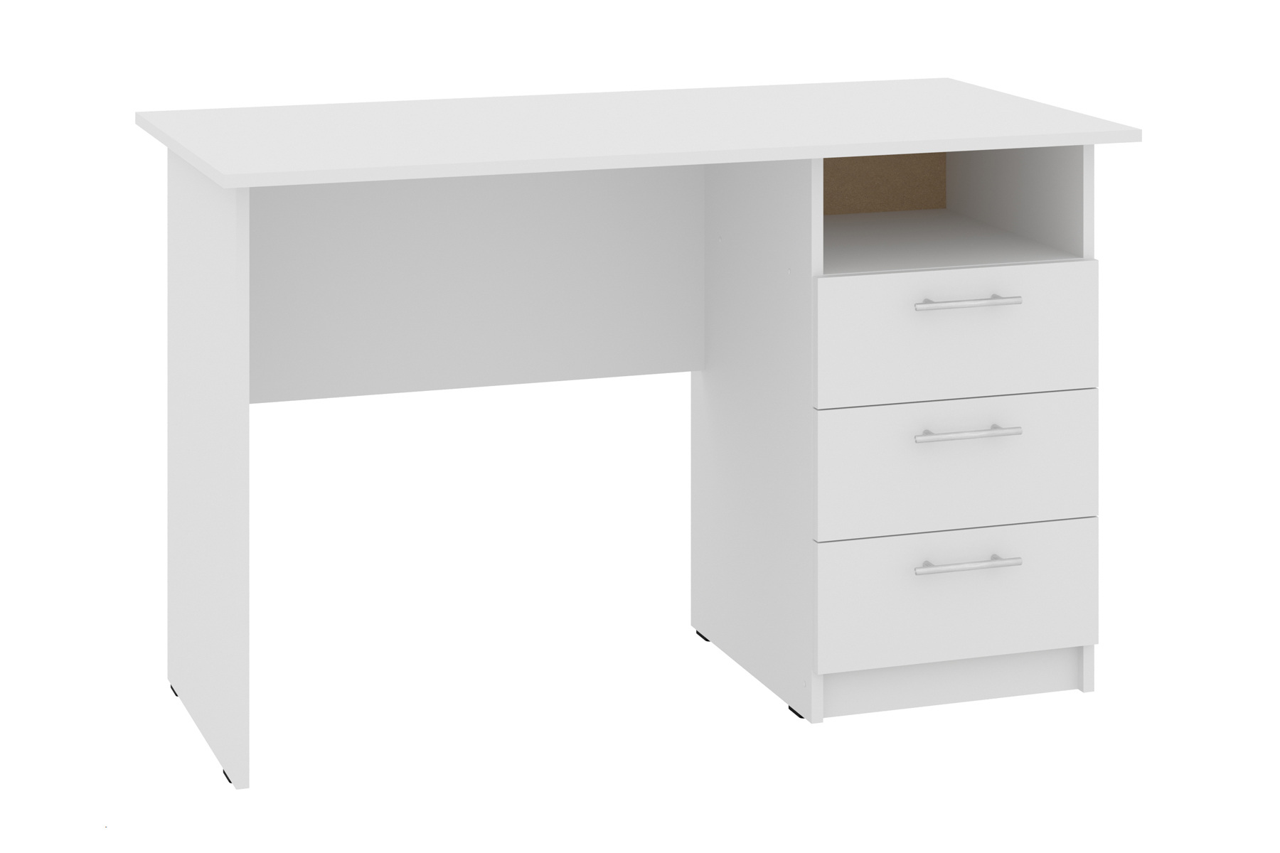Стіл оснащений трьома висувними шухлядами, які забезпечують достатньо місця для зберігання. Над ними розташована відкрита поличка для речей, папок чи паперів. Цей письмовий стіл стане простим, але цінним доповненням до вашого робочого середовища, поєднуючи в собі невибагливість і функціональність.