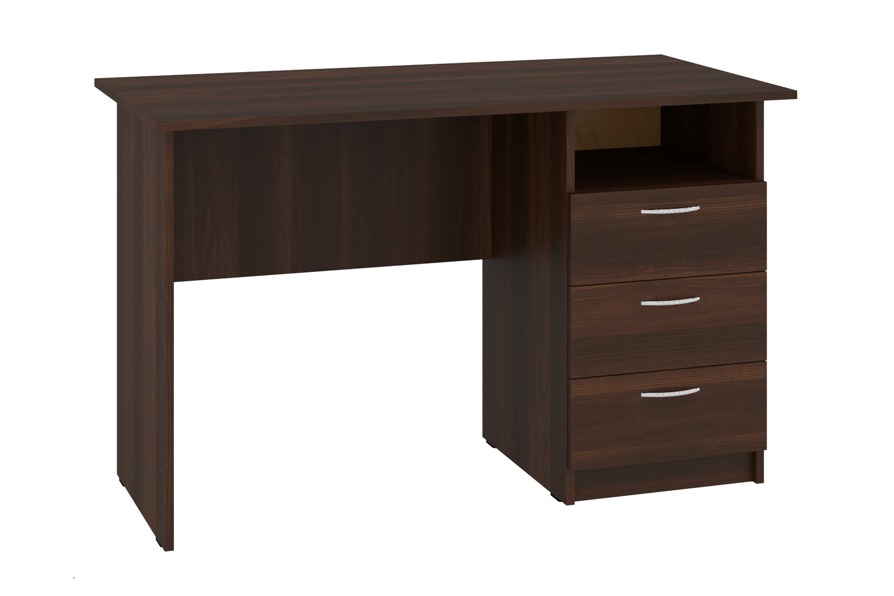 Стіл оснащений трьома висувними шухлядами, які забезпечують достатньо місця для зберігання. Над ними розташована відкрита поличка для речей, папок чи паперів. Цей письмовий стіл стане простим, але цінним доповненням до вашого робочого середовища, поєднуючи в собі невибагливість і функціональність.