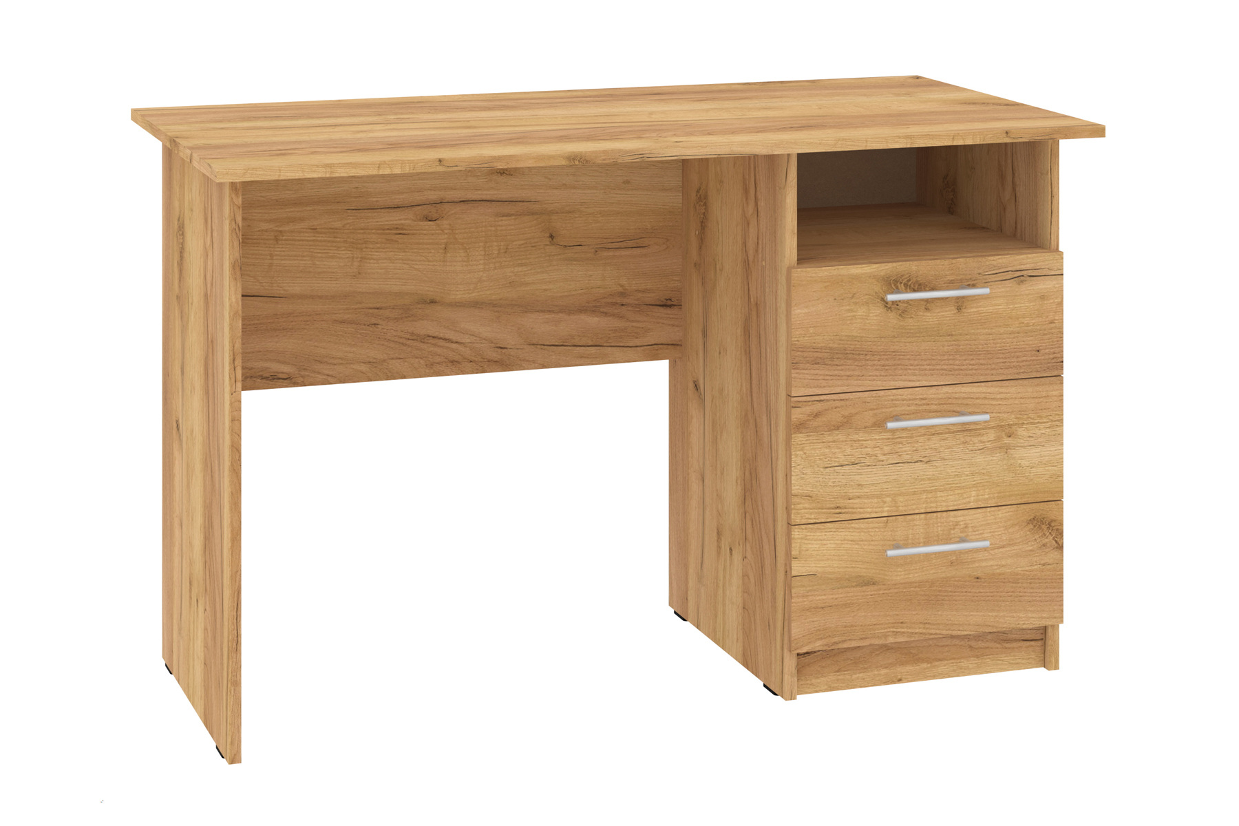 Стіл оснащений трьома висувними шухлядами, які забезпечують достатньо місця для зберігання. Над ними розташована відкрита поличка для речей, папок чи паперів. Цей письмовий стіл стане простим, але цінним доповненням до вашого робочого середовища, поєднуючи в собі невибагливість і функціональність.