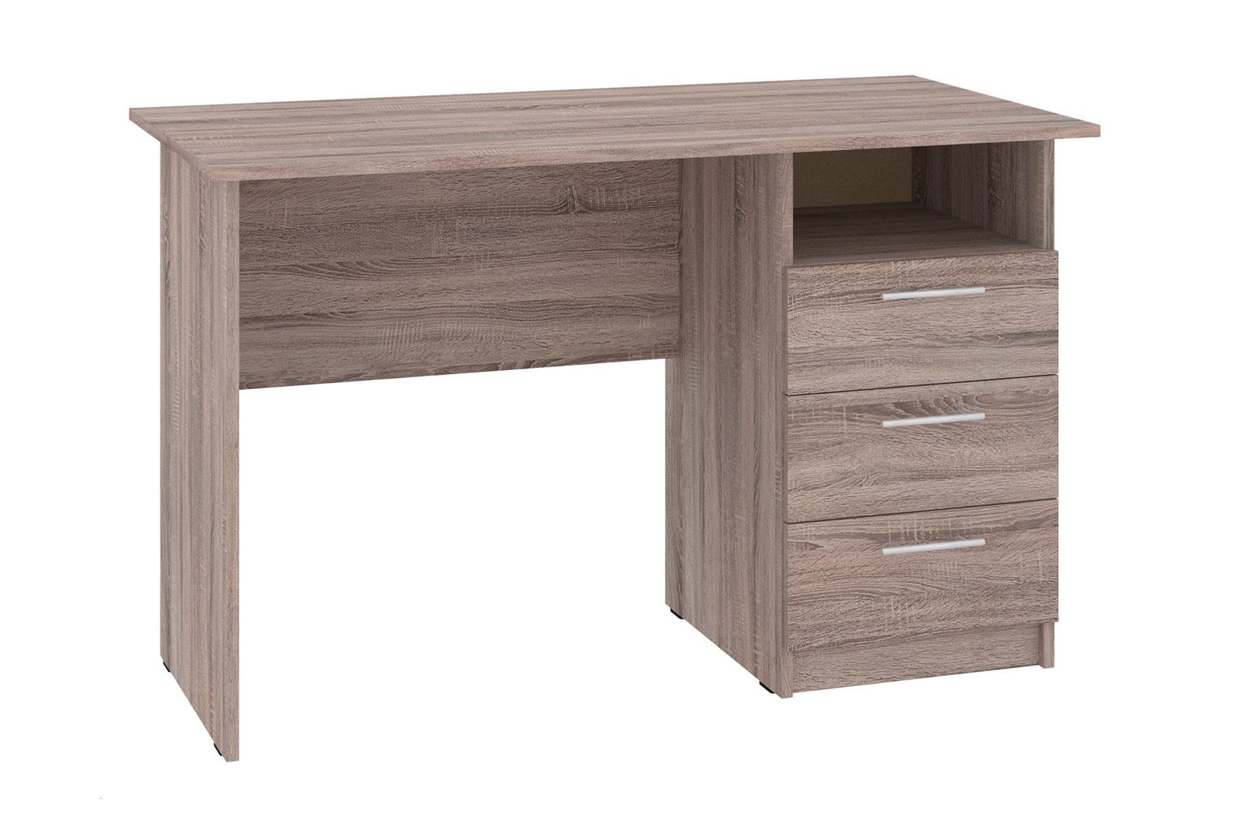 Стіл оснащений трьома висувними шухлядами, які забезпечують достатньо місця для зберігання. Над ними розташована відкрита поличка для речей, папок чи паперів. Цей письмовий стіл стане простим, але цінним доповненням до вашого робочого середовища, поєднуючи в собі невибагливість і функціональність.