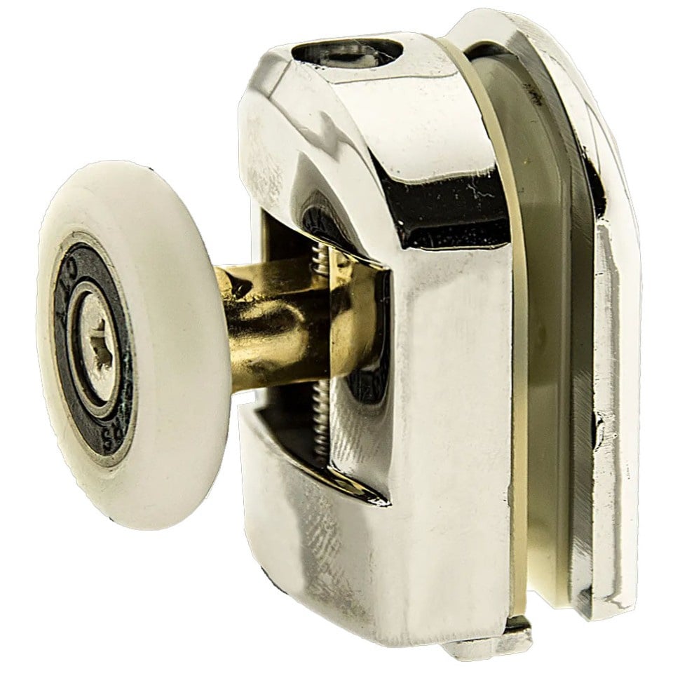 Ролик В-902 В (верхний, одинарный, поворотный, не нажимается) для душевой кабины. С диаметром колес 19, 23, 26, 28 мм. Ставится в верхней части стекла. Задняя часть ролика закрывается декоративным хромированным колпачком. Корпус пластиковый, поворотное колесо, все металлические детали изготовлены из нержавеющих материалов. Посадочные детали изготовлены из пластика, что предотвратит повреждение стекла при установке ролика. При подборе ролика нужно точно знать внутренний диаметр посадочного отверстия в стекле. На данной модели ролика посадочный диаметр составляет 11 мм, под проем в стекле 12 мм. Вылет колеса составляет 24 мм.