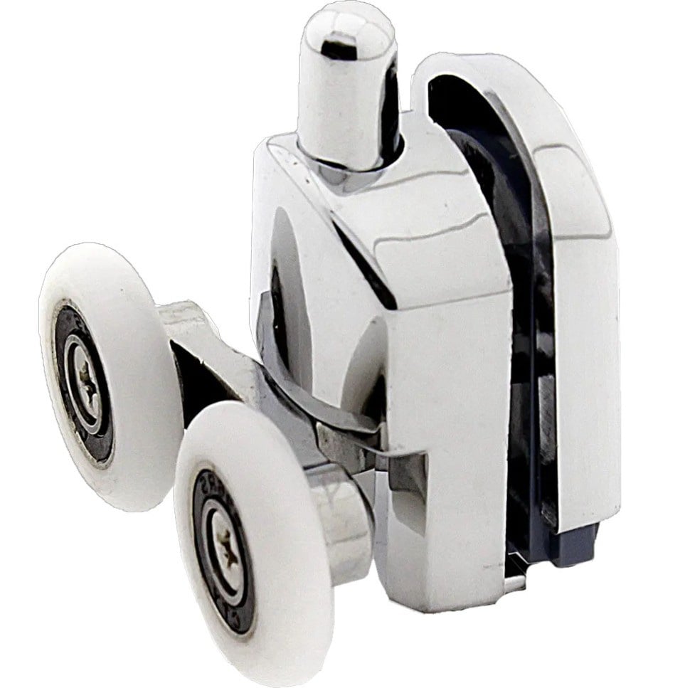 Ролик двойной, пластиковый, поворотный, нажимной, для душевой кабины и гидробокса. С диаметром колеса от 19 мм до 28 мм. Ролик душевой кабины двойной, нажимной, ставится в нижней части стекла. Задняя часть ролика закрывается хромированным колпачком.