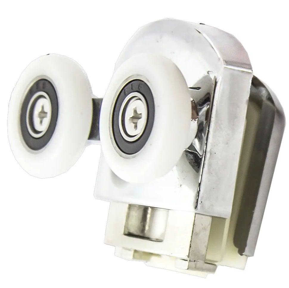 Ролик душевой кабины двойной, нажимной, ставится в нижней части стекла. Задняя часть ролика закрывается хромированным колпачком. Корпус пластиковый, поворотный, Вагонетка с колесами крепится к корпусу ролика подпружиненной кнопкой. Колесо крепится к вагонетке болтом. Посадочные детали изготовлены из пластика, что предотвратит повреждение стекла при установке ролика. При подборе ролика нужно точно знать наружный диаметр колеса. Возможна установка колеса диаметром от 19 до 28 мм.