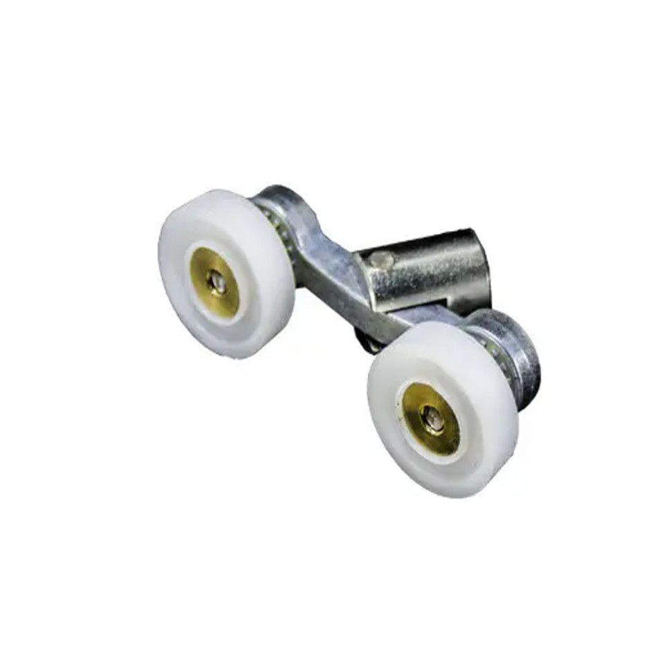 Ролик для душевой А035 двойной, с диаметром колеса 20 мм. Корпус металлический, все металлические детали изготовлены из нержавеющих материалов. Колеса плоские 20 мм диаметром. Колеса съемные - к репиться болтом. В душевых кабинах с двумя дверьми ролики комплектуются по 8 штук. 4 верхних и 4 нижних.