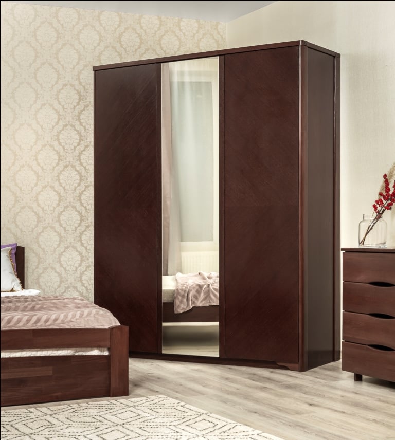Ця тридверна шафа, виготовлена з меблевого щита, вражає своєю міцністю та витонченістю. Центральна дверка обладнана великим дзеркалом, яке візуально розширює простір кімнати та додає комфорту у повсякденному користуванні. Темний відтінок деревини надає шафі благородного вигляду, гармонійно вписуючи її в інтер’єр спальні. В світлому відтінку шафа додасть повітряності і візуального розширення простору.