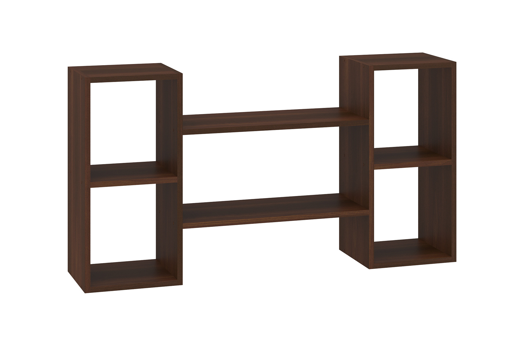Представлена настінна полиця — лаконічного дизайну. Вона має дві подвійні горизонтальні секції, розташовані між двома вертикальними стійками, кожна з яких утворює три відкриті відділення. Полиця виготовлена з матеріалу, що імітує текстуру дерева теплих або холодних відтінків — на вибір. Верхні та нижні частини стійок можна використовувати як додаткові місця для зберігання чи декору.