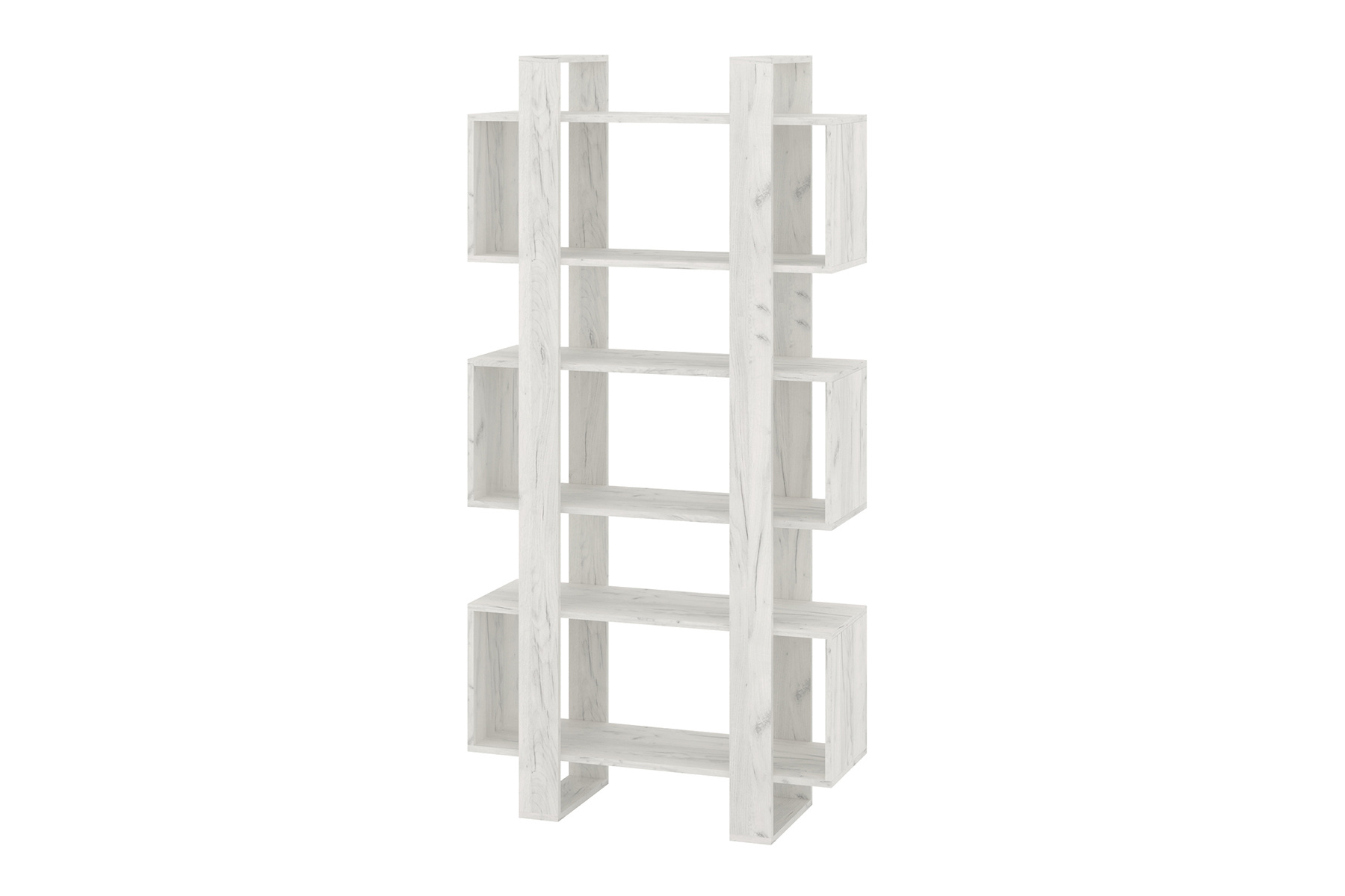 Цей стелаж із асиметричним дизайном створює унікальний візуальний акцент у приміщенні. Полиці, розташовані на різних рівнях, пропонують гнучкі можливості для зберігання та експонування різноманітних предметів, від книг до декоративних аксесуарів. Особливо привертають увагу і додають «родзинки» передні вертикальні лінії.