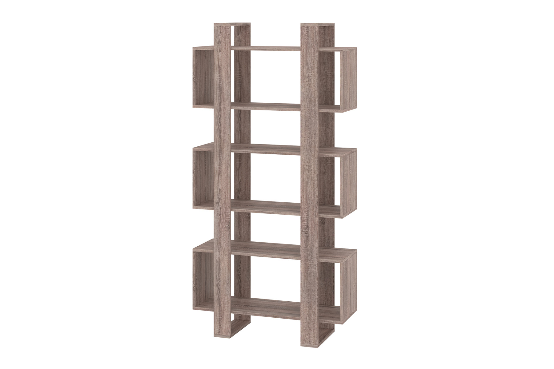 Цей стелаж із асиметричним дизайном створює унікальний візуальний акцент у приміщенні. Полиці, розташовані на різних рівнях, пропонують гнучкі можливості для зберігання та експонування різноманітних предметів, від книг до декоративних аксесуарів. Особливо привертають увагу і додають «родзинки» передні вертикальні лінії.