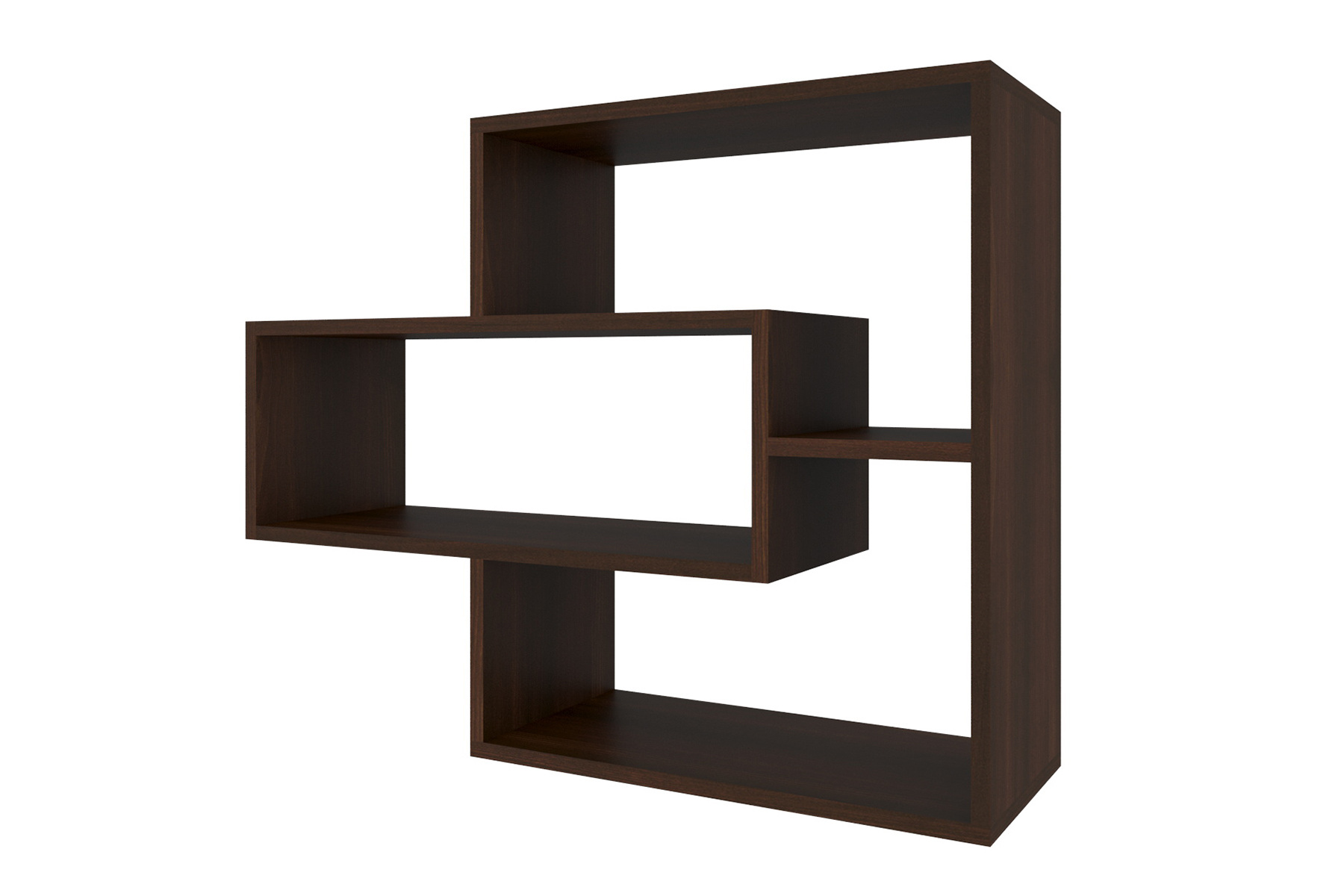 Ця настінна книжкова полиця є справжнім витвором сучасного дизайну завдяки своїй унікальній геометрії. Вона складається з кількох прямокутних сегментів, які, ніби граючи з простором, створюють неповторний асиметричний малюнок. Великі й малі відділення розташовані на різних рівнях, що дозволяє зручно розмістити як книги, так і декоративні елементи.