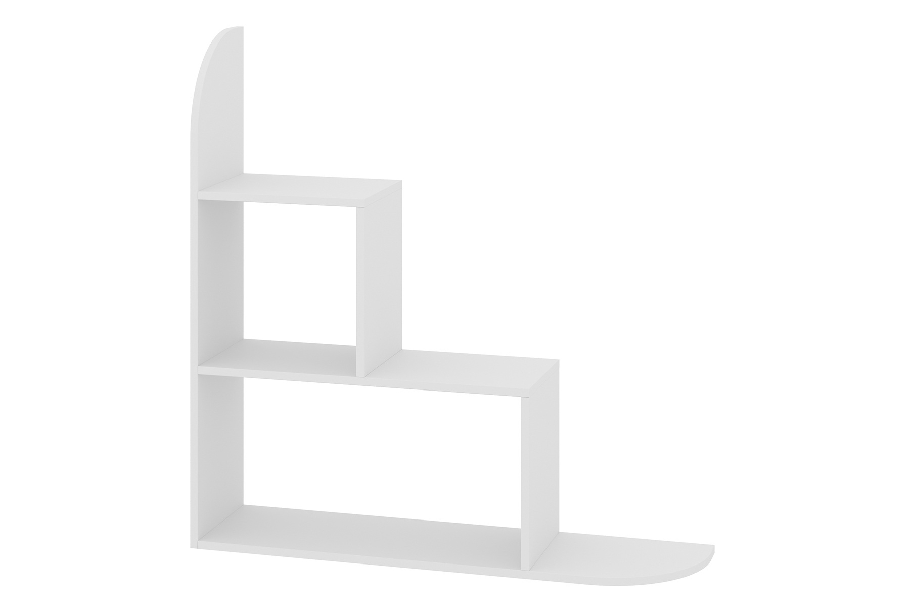 З однієї сторони стелаж має вертикальну панель, яка плавно переходить у нижню горизонтальну основу, що забезпечує стійкість конструкції. Округлені кути додають меблевому елементу м'якості і безпеки, що особливо важливо в інтер'єрах з дітьми.