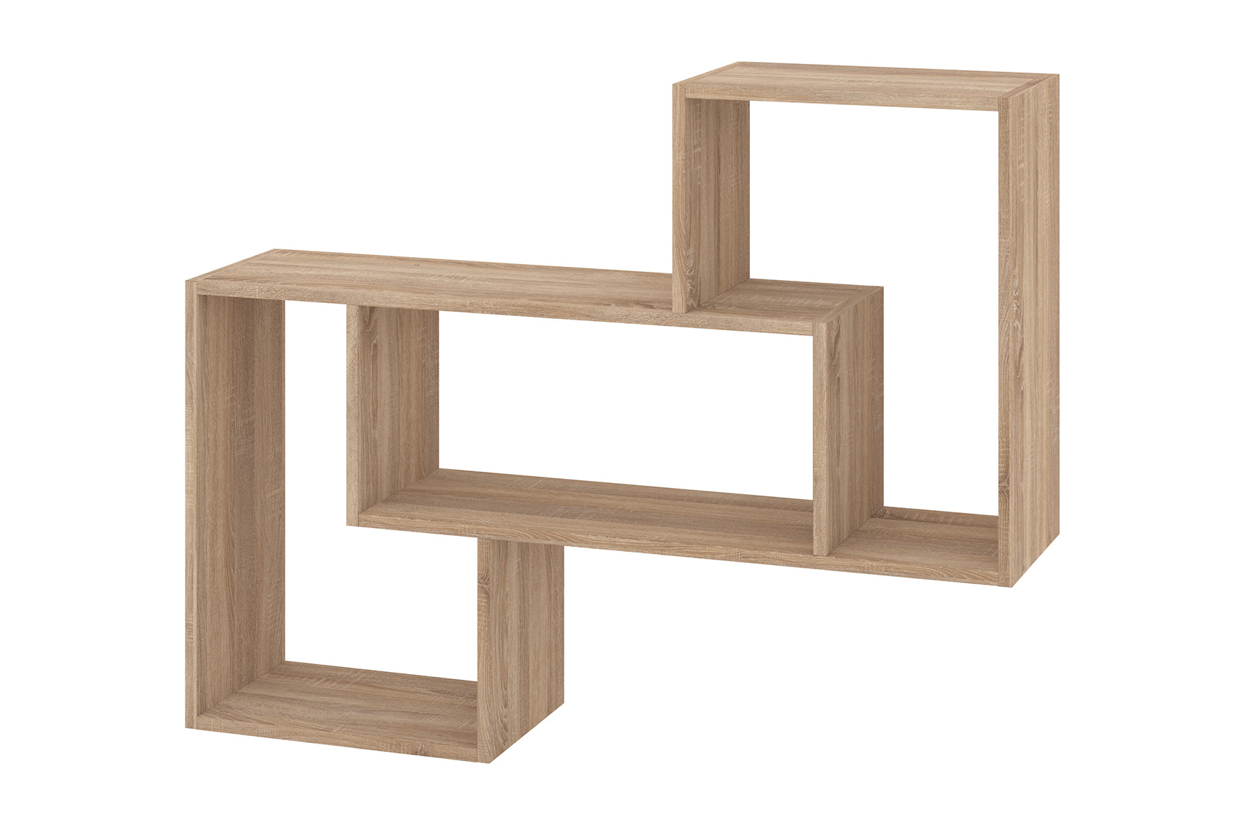 Три відділення розташовані в асиметричному порядку, що створює цікавий візуальний ефект. Подібний варіант настінної полиці приваблює око та дозволяє творчо використати її простір для оздоблення приміщенні різними декоративними елементами.