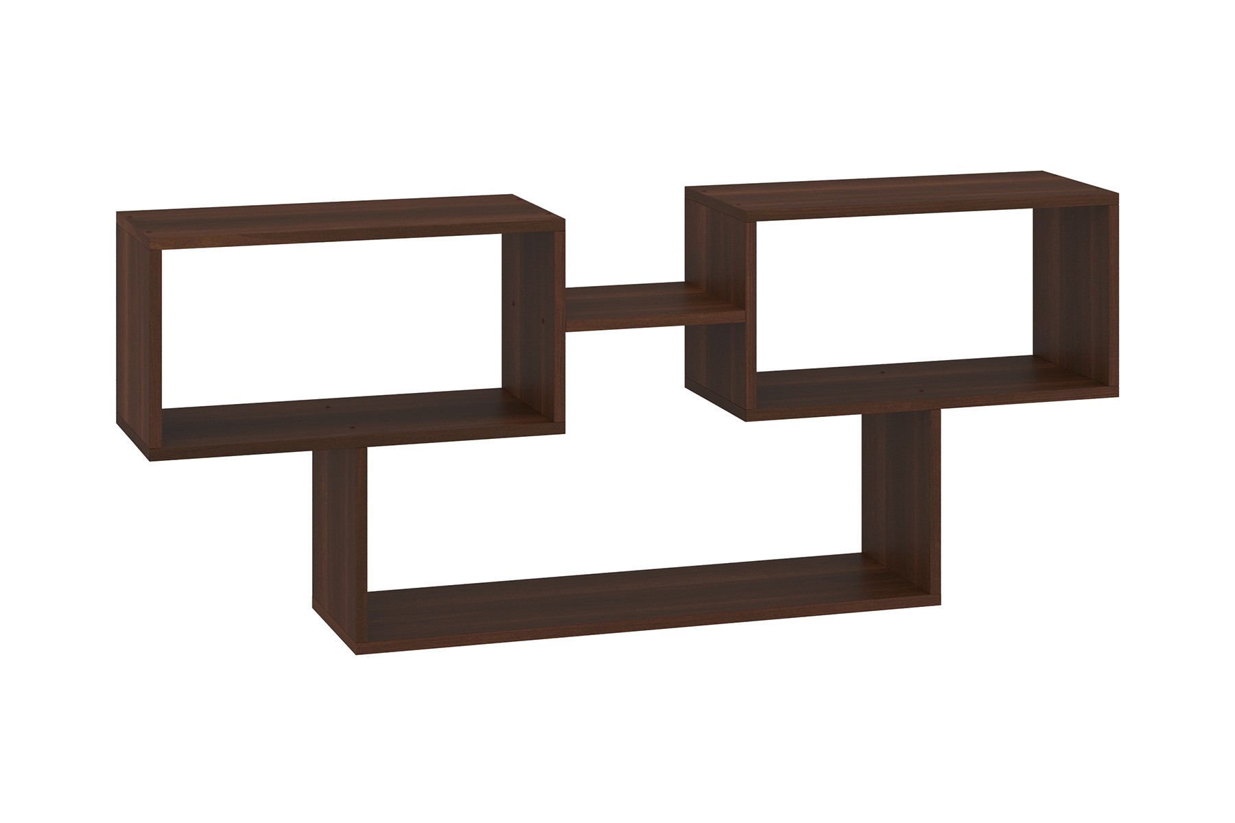 Ця настінна полиця приваблює увагу своїм нестандартним дизайном та асиметричною формою. Вона складається з трьох основних прямокутних відсіків, два з яких розташовані горизонтально на одному рівні, а третій - нижче, створюючи унікальну конфігурацію. Між верхніми відсіками є невелика полиця-перемичка, яка додає конструкції додаткової стійкості та функціональності. На ній можна зберігати маленькі сувеніри або елементи декору.